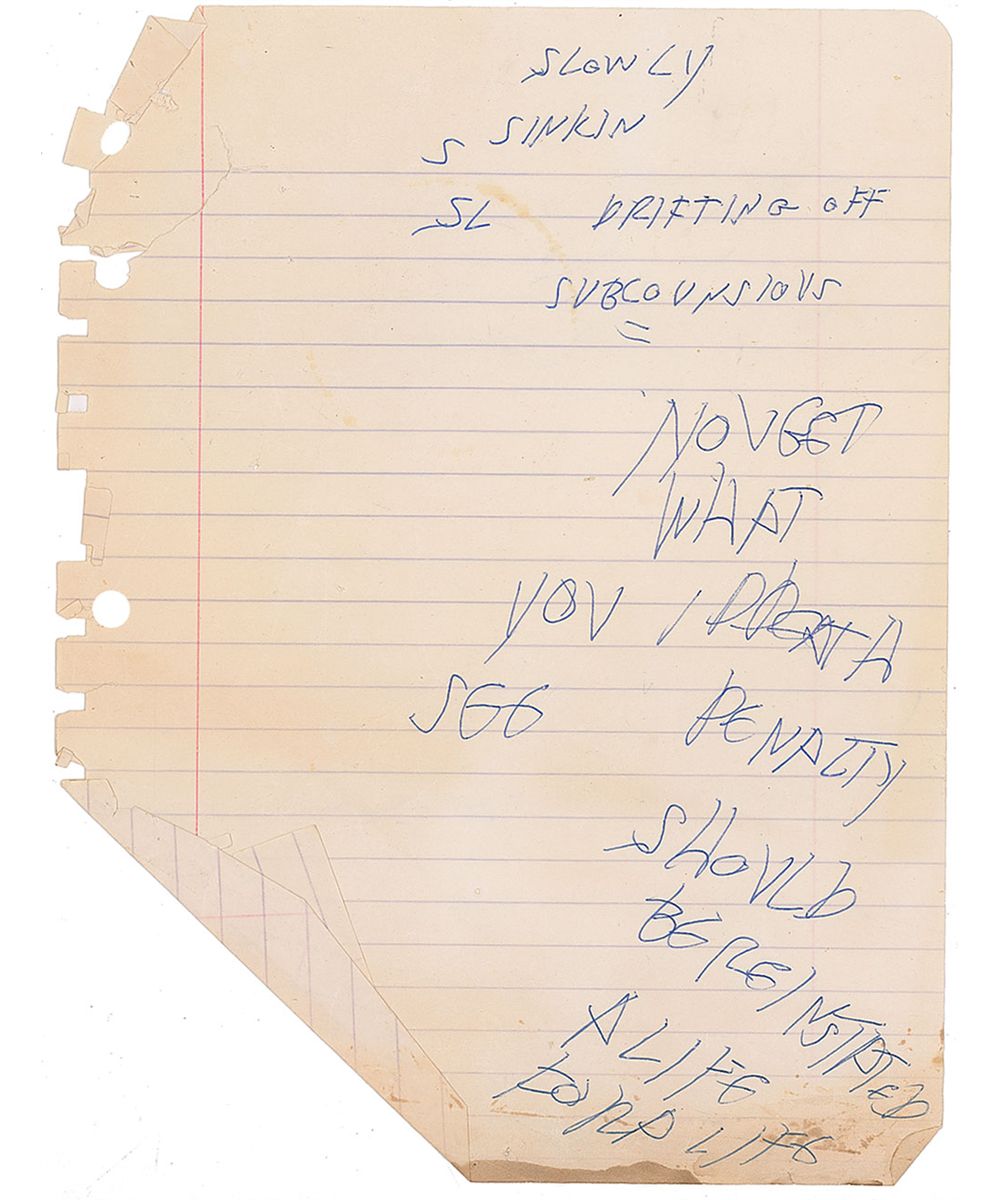 Handwritten notes by Joey Ramone on an off-white 8.25 x 10.5 lined sheet of notebook paper. Ramone writes (with grammar and spelling retained): “Slowly sinkin drifting off subconsious/You get what you see/Death penalty should be reinstated/A life for a life.” Scattered light toning and staining, a few moderate creases, a couple edge tears, and a rough left edge, otherwise very good condition. Interesting, and apparently quite personal, thoughts on a delicate subject. Provenance: Joey Ramone Estate. Accompanied by a letter of authenticity from the Joey Ramone Estate.
