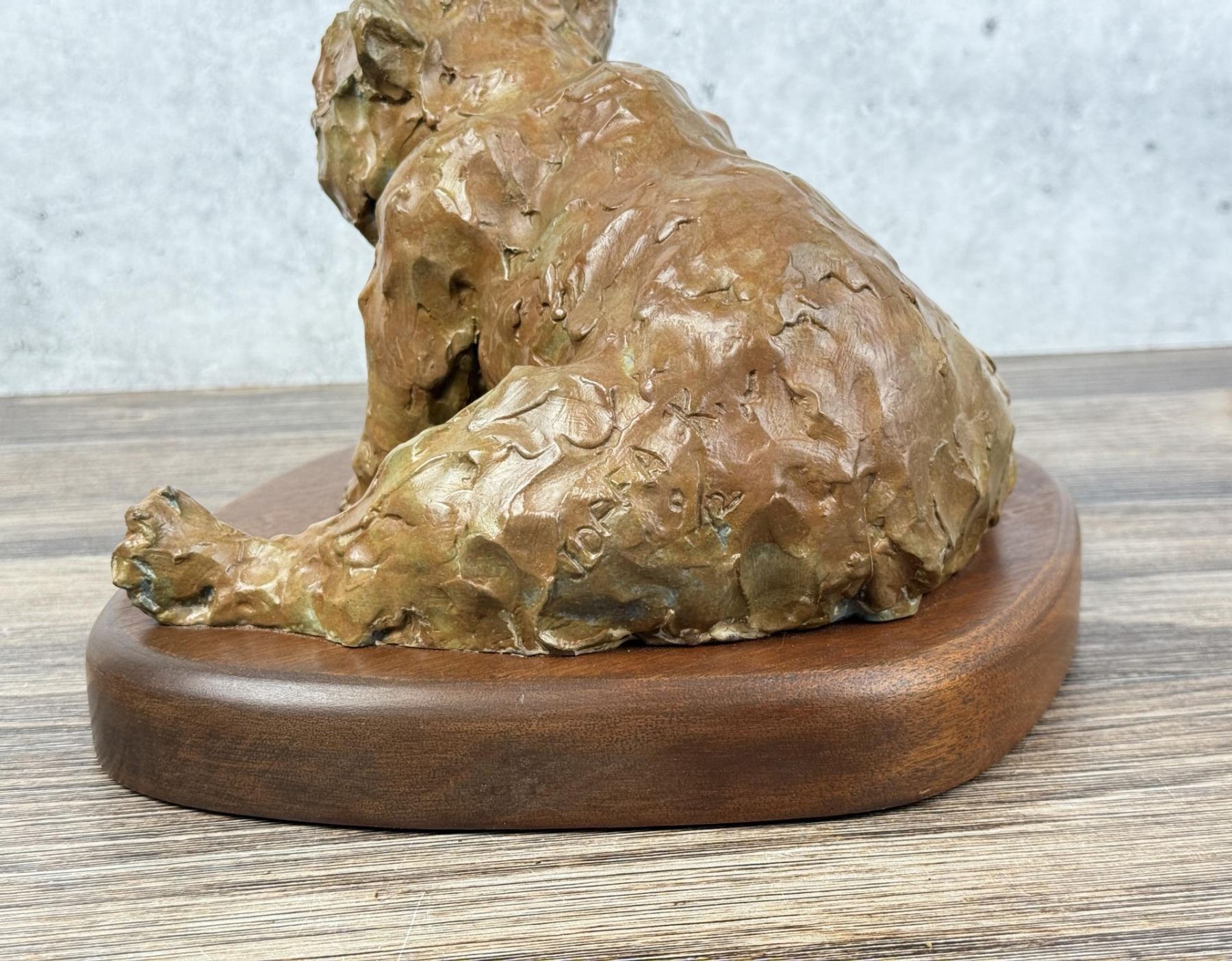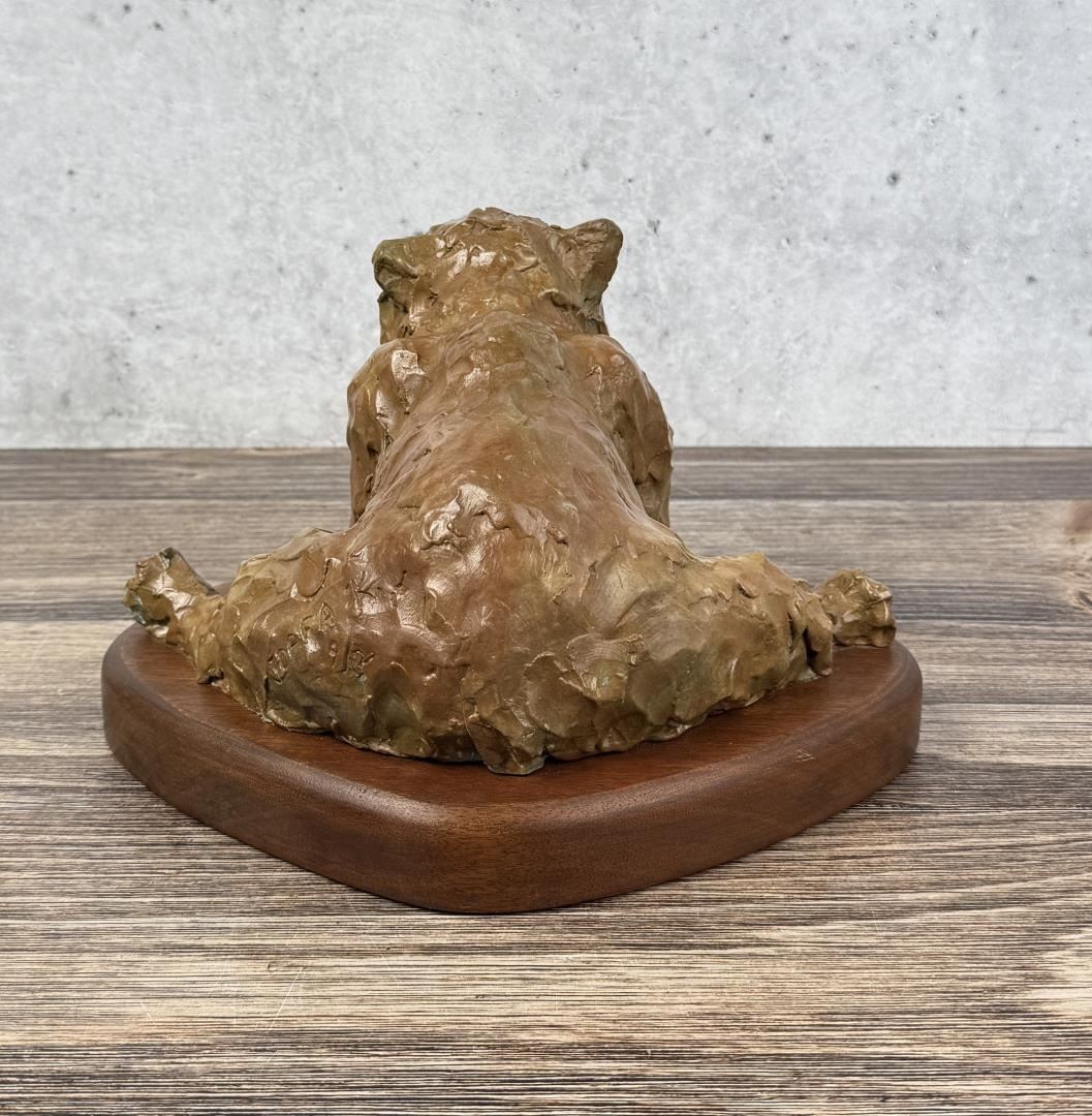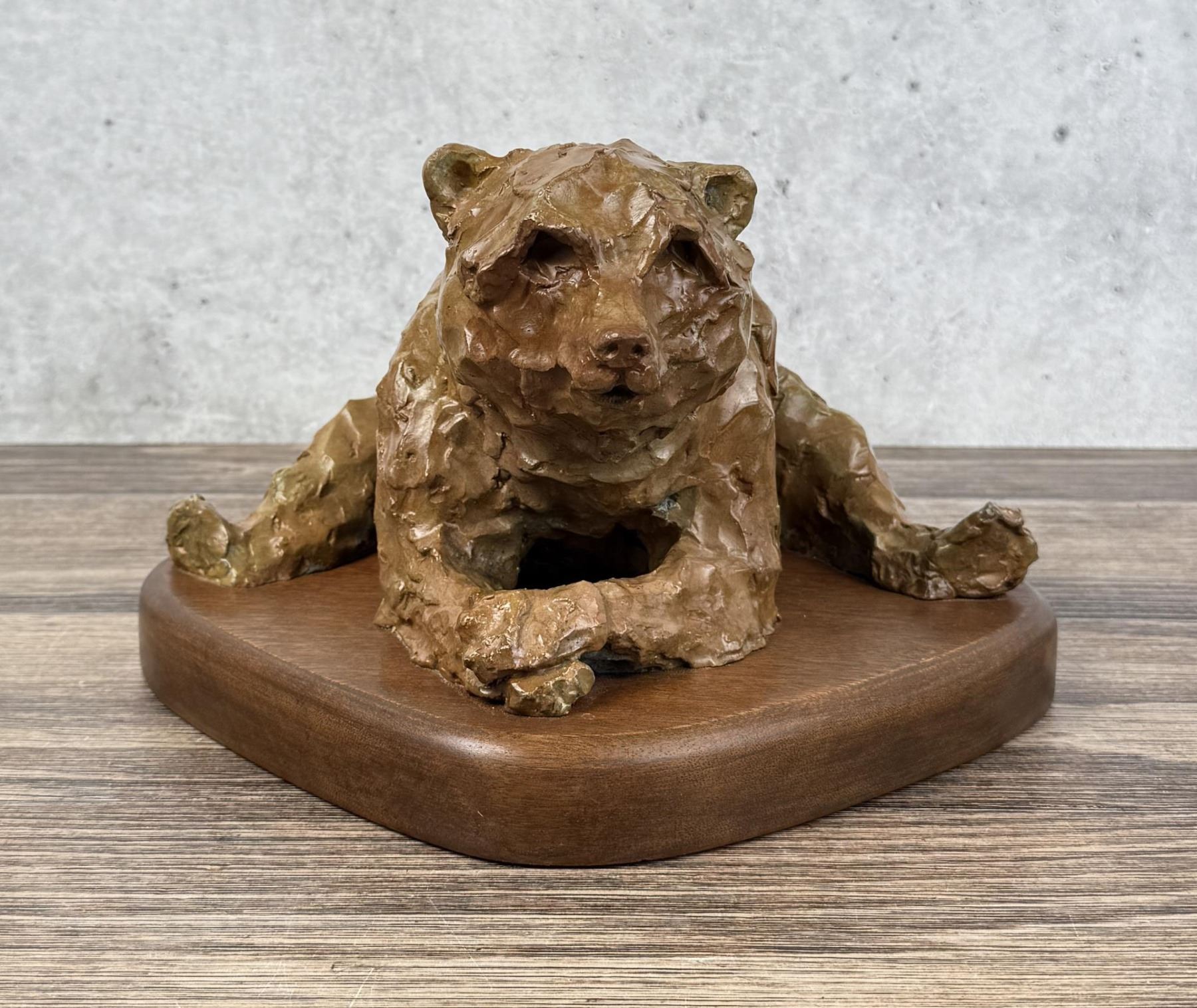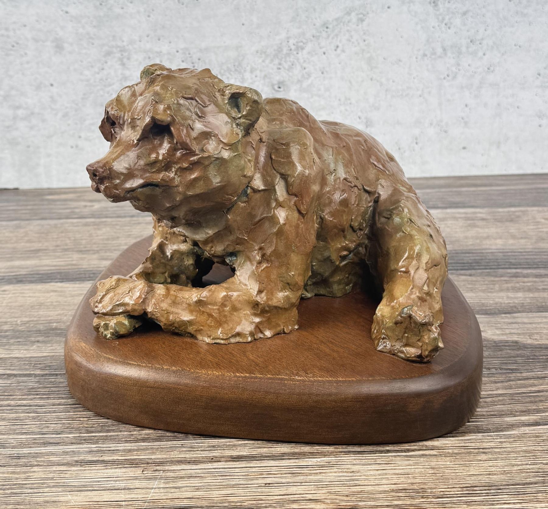Title is Resting Bear. 10" by 10" by 7 1/8". Joffa Kerr (Born 1935) is active/lives in Wyoming, Texas. Joffa Kerr is known for Animal and wildlife sculpture. Joffa Kerr was born in Nacodoches, Texas. She attended the University of Oklahoma and studied interior design and art. Joffa and her husband of 39 years, William G. Kerr, have raised four children, six dogs and numerous horses. In 1982 Joffa began a serious art career and has since studied anatomy with several artists. She has attended a series of Scottsdale Artist School courses with noted sculptors Ken Bunn, Sherry Sander, Kent Ullberg and Glenna Goodacre. The artist admits to a certain affection for bears and other animals of large mass, which turned her attention to pigs, on which she bestows funky names such as Swinelet O'Hara. Her husband teases her about the current obsession, saying, "Honey, do you want to be known as a pig sculptor?" The good-natured Kerr responds with a laugh, "I don't care just so long as I'm known." Her work is presently available in galleries in Arizona, California, Colorado, New Mexico, New York, Oklahoma, Texas and Wyoming. Prior exhibits include the Albuquerque Museum, Gilcrease Museum and Oklahoma City Museum of Art. Joffa has done commissions for The Nature Conservancy, The Grand Teton Music Festival and Lori Corporation. Public and corporate collectors besides those just mentioned, include Nichols Hills Park, and The Williams Companies, Inc. In 1987 the artist and her husband donated 250 artworks to what was then called the Wildlife of the American West Art Museum in Jackson Hole, WY. Not content with the status-quo, they were instrumental in launching a $10 million fundraising effort for a museum expansion in 1993. "All of our friends were artists, and we thought more people should see their work," says Kerr. The museum, now called the National Museum of Wildlife Art, moved to its new 51,000-square-foot facility in 1994. With 12 galleries with changing exhibitions showcasing 2,200 artworks, the museum tells the story of the western frontier—the native cultures, wildlife, and landscape. "Some of our visitors have never been to a museum before, and we hope we're educating them," Kerr says. The museum's contribution to the cultural life of the Rocky Mountain region can be seen in the statistics: 2,200 members, 125,000 visitors annually, and education programs reaching 7,200 children.