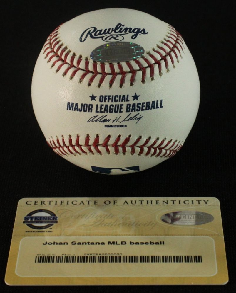 Official Major League Baseball. Hand-signed in blue ink by Johan Santana (Mets). The autograph includes a Steiner hologram and matching COA for authenticity purposes.