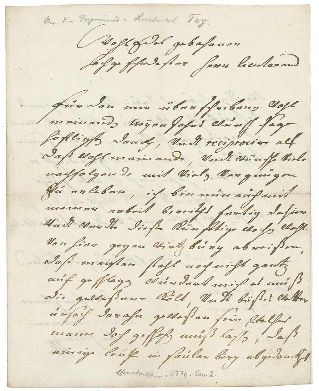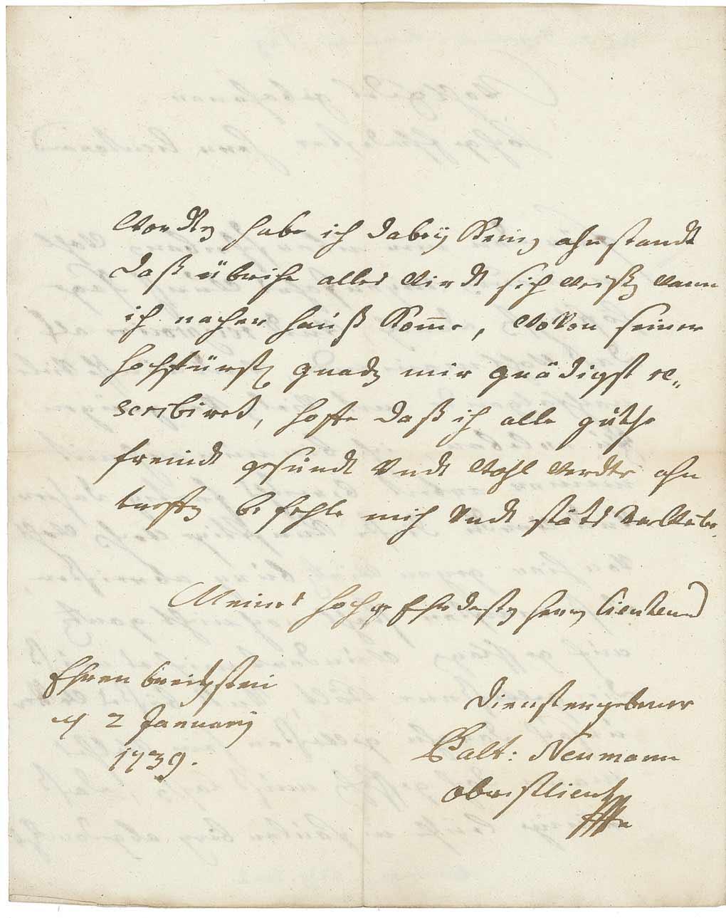 Renowned Bohemian-born architect (1687–1753) best known for the Würzberg Residence and the Basilica of the Vierzehnheiligen. ALS in German, signed “J. Balt. Neumann,” one page both sides, 7 x 9, January 2, 1739. Letter to his collaborator, architect and engineer Lieutenant Joseph Raphael Tatz. In part (translated): "For your good wishes for the New Year which you so kindly sent me I express my fondest thanks…and desire to live to see many happy returns of the day; I have now completed my work here and will probably depart for Wuertzburg these coming weeks.” Intersecting folds, a couple pencil notations to first page, and writing from opposing sides lightly showing through, otherwise fine condition.