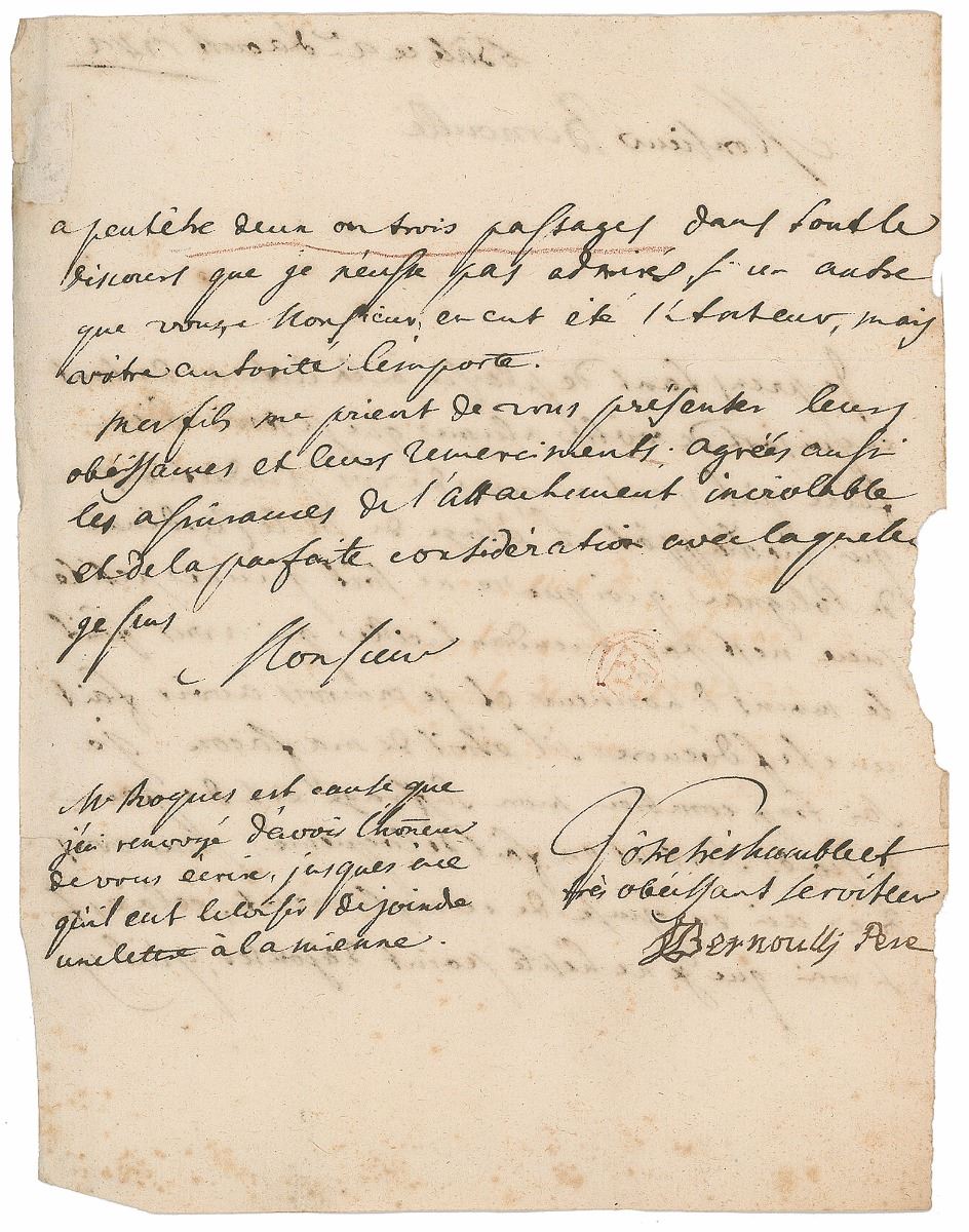 The recipient, Jean-Jacques de Mairan, was himself a noted scientist who made discoveries in several fields including astronomy and biology. The three sons that Bernoulli mentions at the end of his letter were also brilliant mathematicians: Nicolaus studied probability and was a friend of Leonhard Euler; Daniel made significant progress in fluid mechanics; and Johann II succeeded his father as professor of mathematics at the University of Basel. An extraordinary association piece between titans of the sciences.