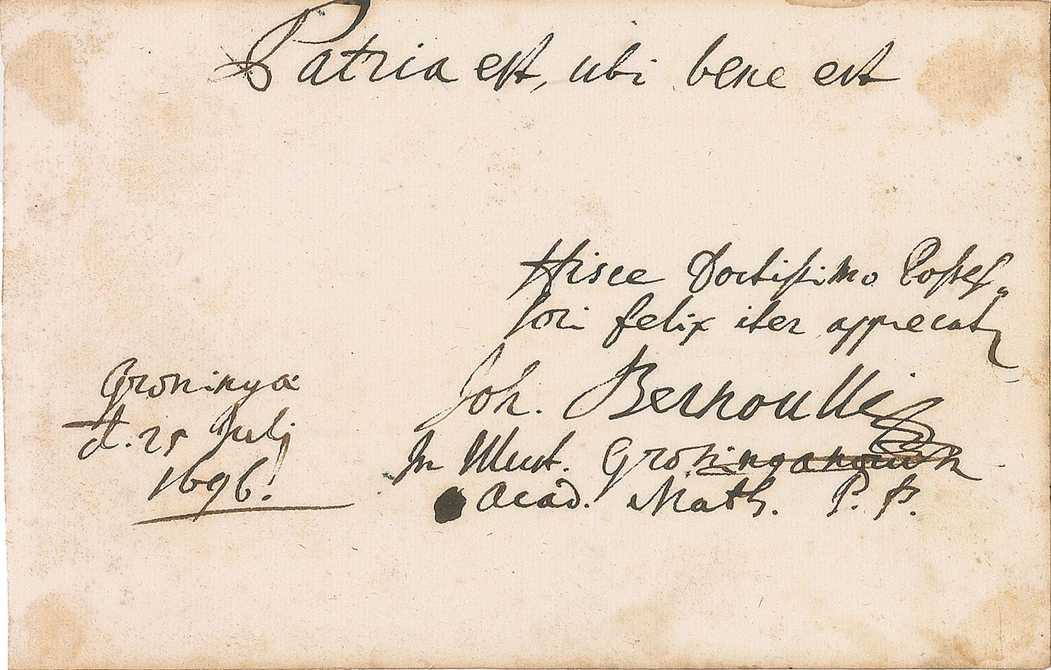 Influential Swiss mathematician (1667–1748) known for his contributions to infinitesimal calculus. Rare AQS signed "Joh. Bernoulli" on an off-white 6 x 4 album page, dated at Groningen, July 25, 1696. As professor of mathematics at the University of Groningen, Bernoulli pens a Latin proverb, "Patria est ubi bene est," dedicating it to a student. In fine condition, with light stains at corners from old mounting traces on the reverse.