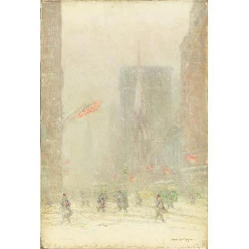<B>JOHANN BERTHELSEN (Danish/American, 1883-1969)</B></I><BR><I>5th Avenue at 57th Street</B></I><BR>Oil on canvas<BR>20 x 16 inches (50.8 x 40.6 cm)<BR>Signed lower right: <I>Johann Berthelsen</B></I><BR>