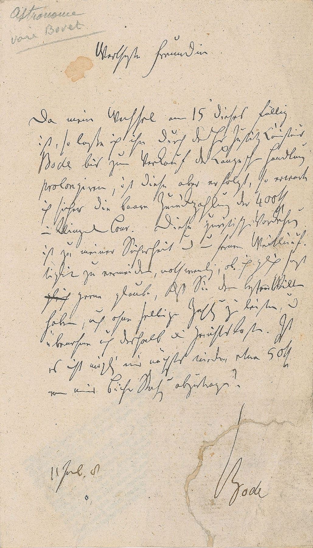 Untranslated ALS in German, signed “Bode,” one page, 4.5 x 7.75, no date. In very good condition, with moderate overall creasing, a small stain, and an old repair to a semicircular tear around the signature.