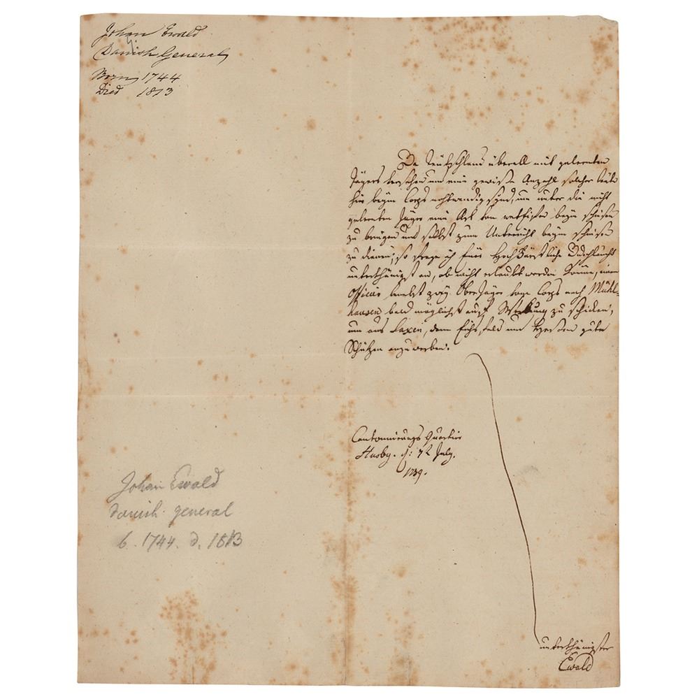 German military officer (1744–1813) who commanded the Jäger corps of the Hessian Leib Infantry Regiment attached to British forces in the American Revolutionary War and was captured at Yorktown in 1781; his 'Essay on Partisan Warfare' was a widely read treatise on guerrilla warfare. Rare ALS in German, signed “Ewald,†one page, 8 x 10, July 12, 1789. Untranslated handwritten letter by Ewald. In fine condition.