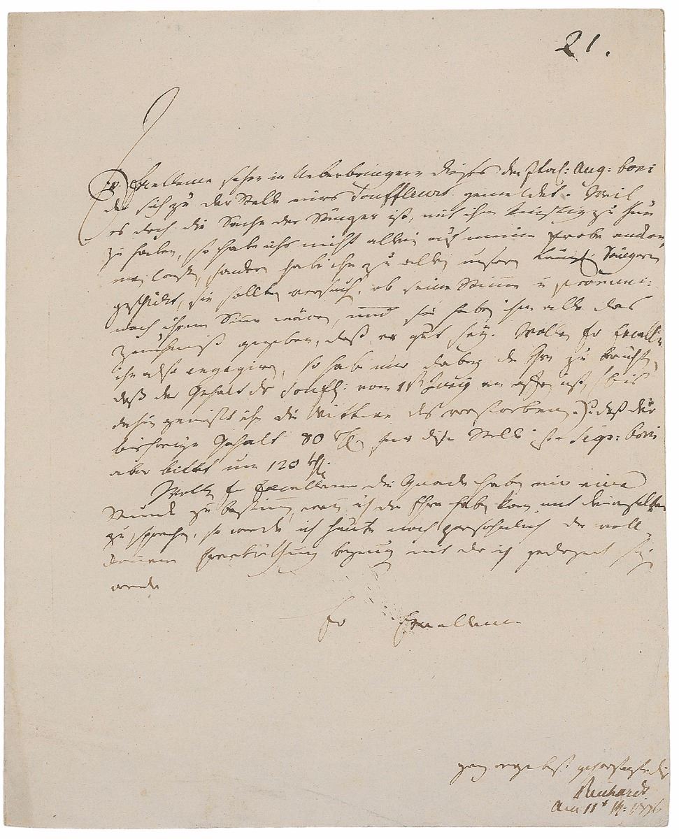 German composer, writer and music critic (1752–1814) who worked under the patronage of Frederick the Great. ALS in German, signed “Reichardt,” one page, 7.5 x 9.25, 1776. Letter recommending the employment of theatre prompter August Boni, in part (translated): "Because the singer is to have to deal with him in the future, I sent him to all our royal singers, so that they should try to see if his voice and pronunciation would be to their favor, and they have all given testimony that he is good.” In fine condition, with trivial creases to lower portion.