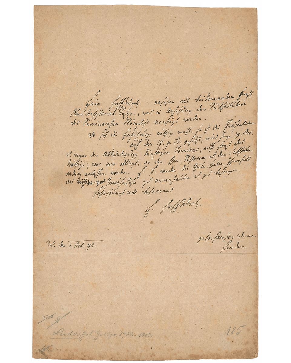 German philosopher, theologian, poet, and literary critic (1744–1803) associated with the periods of Enlightenment, Sturm und Drang, and Weimar Classicism. His most important work came in the fields of comparative philology and cultural anthropology, particularly in studying the concepts of nationality and patriotism. ALS in German, signed “Herder,” one page, 8 x 13, October 7, 1794. Untranslated letter to the civil servant Karl Johann Georg Buttner in Rossla concerning a decision of the Upper Consistory about a seminary student named Schlomilch. Intersecting folds, light overall toning and foxing (heavier along the bottom edge), and a few creases, otherwise fine condition.