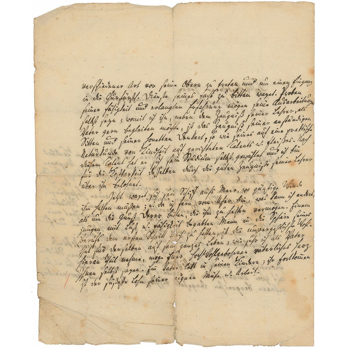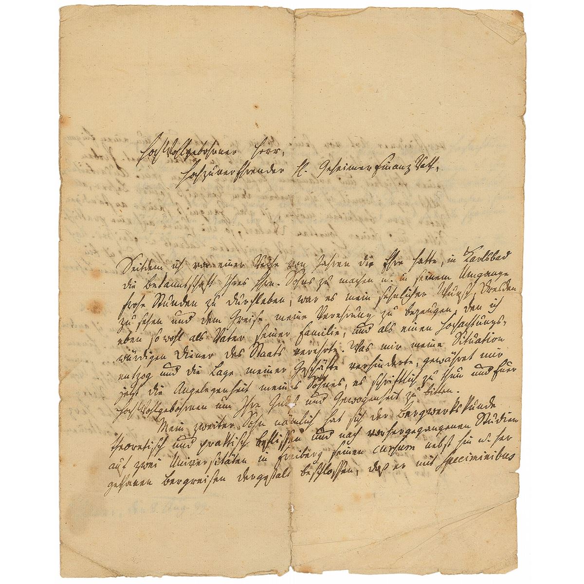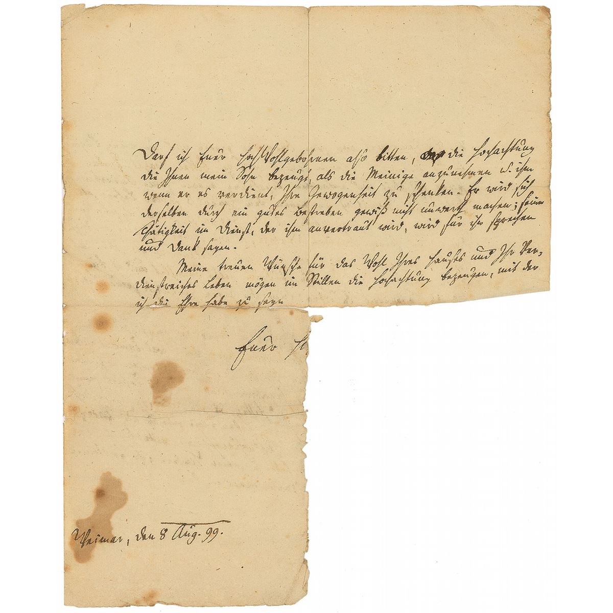 German philosopher, theologian, poet, and literary critic (1744–1803) associated with the periods of Enlightenment, Sturm und Drang, and Weimar Classicism. His most important work came in the fields of comparative philology and cultural anthropology, particularly in studying the concepts of nationality and patriotism. ALS in German, unsigned, three pages on two adjoining sheets, 7.5 x 9, August 8, 1799. Untranslated letter to Geheimen Finanz-Rath, whose son he had met a few years prior, asking him to intercede in a matter on his own son’s behalf. Herder’s son Sigismund August Wolfgang was a geologist and mineralogist who later became chief mining captain of Saxony. Fragile central vertical and horizontal folds with partial separations, one-quarter of the last page excised and absent, scattered stains and creases, and show-through from writing to opposing sides, otherwise very good condition.