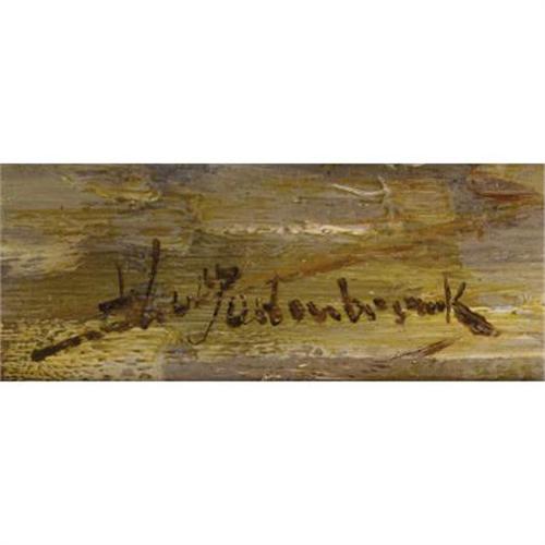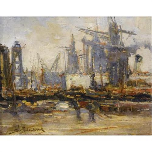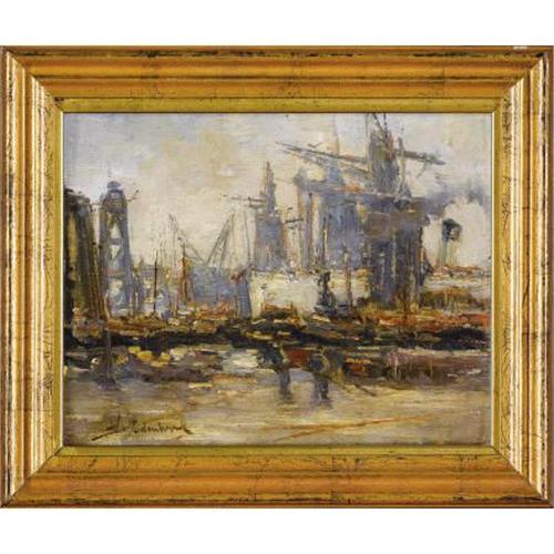 <B>JOHANN HENDRIK MASTENBROEK (Dutch, 1875-1945)</B></I><BR><I>Workers in the Harbor</B></I><BR>Oil on panel<BR>9-1/4 x 11-3/4 inches (23.5 x 29.8 cm)<BR>Signed lower left:<I> H. Mastenbroek</B></I><BR> <B>Condition Report:</B> Overall good condition.<BR><BR><b>Shipping:</b> Framed - without Glass, Small (<a target="_blank" href="http://www.heritageauctions.com/common/shipping.php">view shipping information</a>)