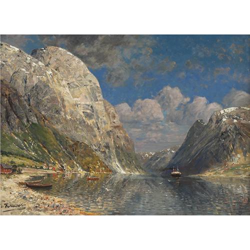 Johann Holmstedt (Swedish,1851-1929), Scandanavian Fjord, c.1900; oil/canvas,23in. x 31in., signed.