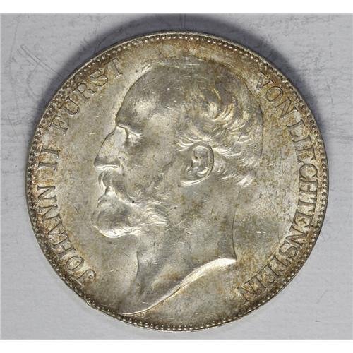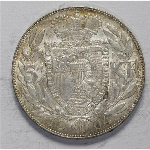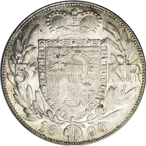 <B>Johann II 5 Kronen 1904, </B></I>KM-Y4, toned AU-UNC, full underlying mint luster.<BR><I>From the Monedas Oro Collection</B></I><BR><BR><b>Shipping:</b> Coin/Currency (<a target="_blank" href="http://www.heritageauctions.com/common/shipping.php">view shipping information</a>) <BR><BR><B>Important not
