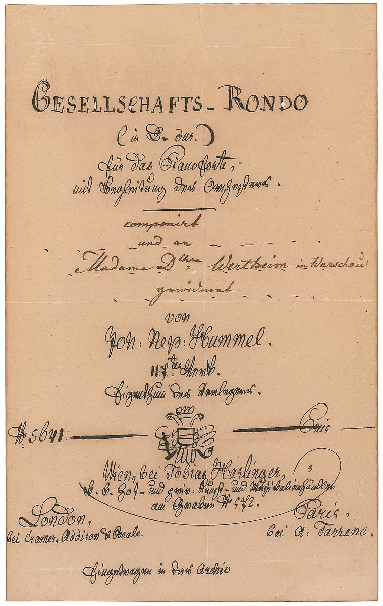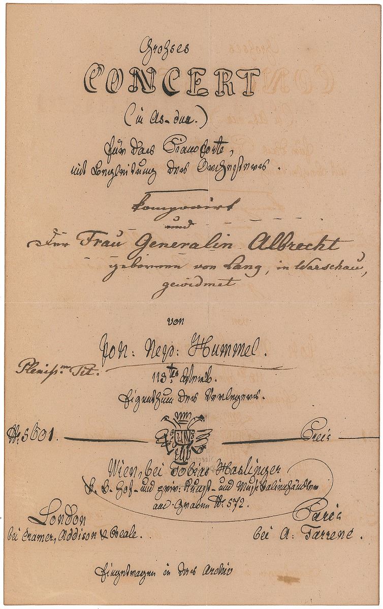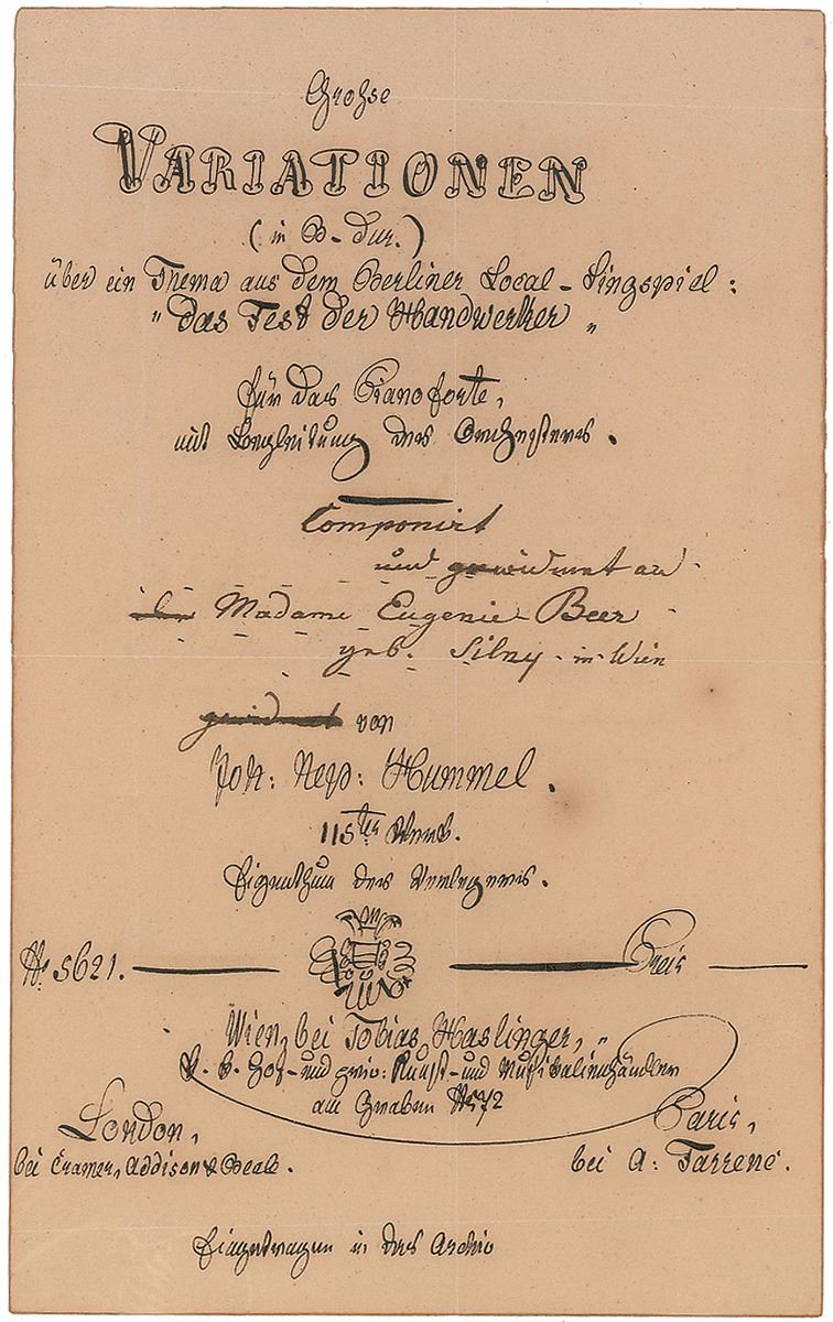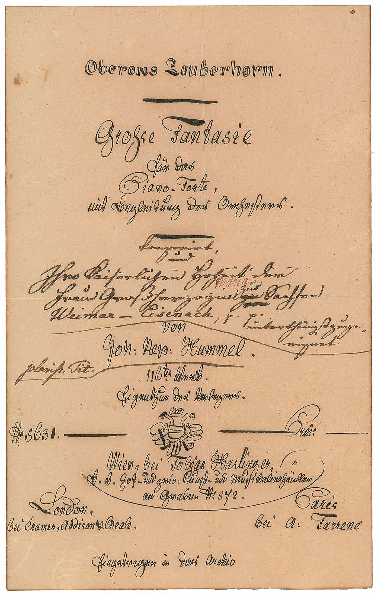 Austrian composer and virtuoso pianist (1778–1837). Collection of four handwritten title pages for Hummel’s works, each one page, 5 x 8, no date but circa 1829. Drafts drawn in an artist’s hand for the title pages of "Grosses Konzert in As-Dur" (op. 113), "Grosse Varationen uber ein Thema aus dem Berliner Local-Singspiel Das Fest der Handwerker" (op. 115), "Oberons Zauberhorn" (op. 116), and "Gesellschafts-Rondo" (op. 117), all unsigned but inscribed in Hummel’s hand to the Grand Duchesses of Saxe-Weimar-Eisenach, the wife of one army general Albrecht, Eugenie Beer, and Madame Dorothea Wertheim at Warsaw. Fragile central vertical and horizontal folds with partial edge separations, uniform toning, and slight foxing, otherwise overall fine condition. These works were to be published by the Viennese publisher Tobias Haslinger.