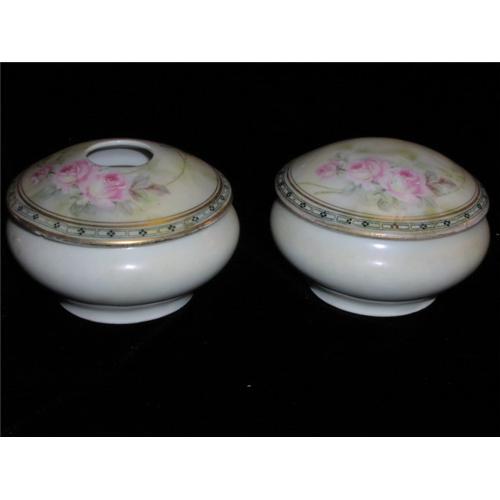 <P>This set consists of two pieces: hair receiver and powder jar. Both feature gorgeous pink roses - you really must see the photos. The lids have a dual-circle of gilding encompassing the lid. There is also some graphic art design along the rim followed by another line of gilding.