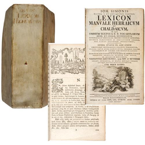 <Our item number 141039><B>Johann Simonis. 1756 First Edition Jewish Dictionary.</B> "LEXICON MANUALE HEBRAICUM ET CHALDAICUM," First Edition, Jewish Dictionary, 8 x 5 x 2¾ in., sheep-skin covers, 1,082 pages with separate preface. Written by noted scholar Johann Simonis (1698-1768) and printed at Halle, Germany. The author was a professor of Theology and Church History, and well respected lexicographer. Informative text contains Simonis' comprehensive lexicon of the Hebrew, Chaldaic and Latin languages. This treatise remained popular for several decades, passing through many subsequent editions. First English translation was issued in 1832. Binding is vellum. This rare book remains in very good condition with some very scattered small internal notations from the owner. Volume bound in contemporary vellum, early hand titling to spine, couple of unobtrusive institutional markings, inner front hinge cracked, scattered foxing, occasional marginalia and underscoring. Generally clean int ernally. <BR>Estimated Value $200 - 400. <BR><BR>Our item number 141039<BR><IMAGES><P ALIGN="CENTER"><IMG SRC="http://www.goldbergcoins.net/liveauction/49jpegs/141039.jpg"> </P></IMAGES>