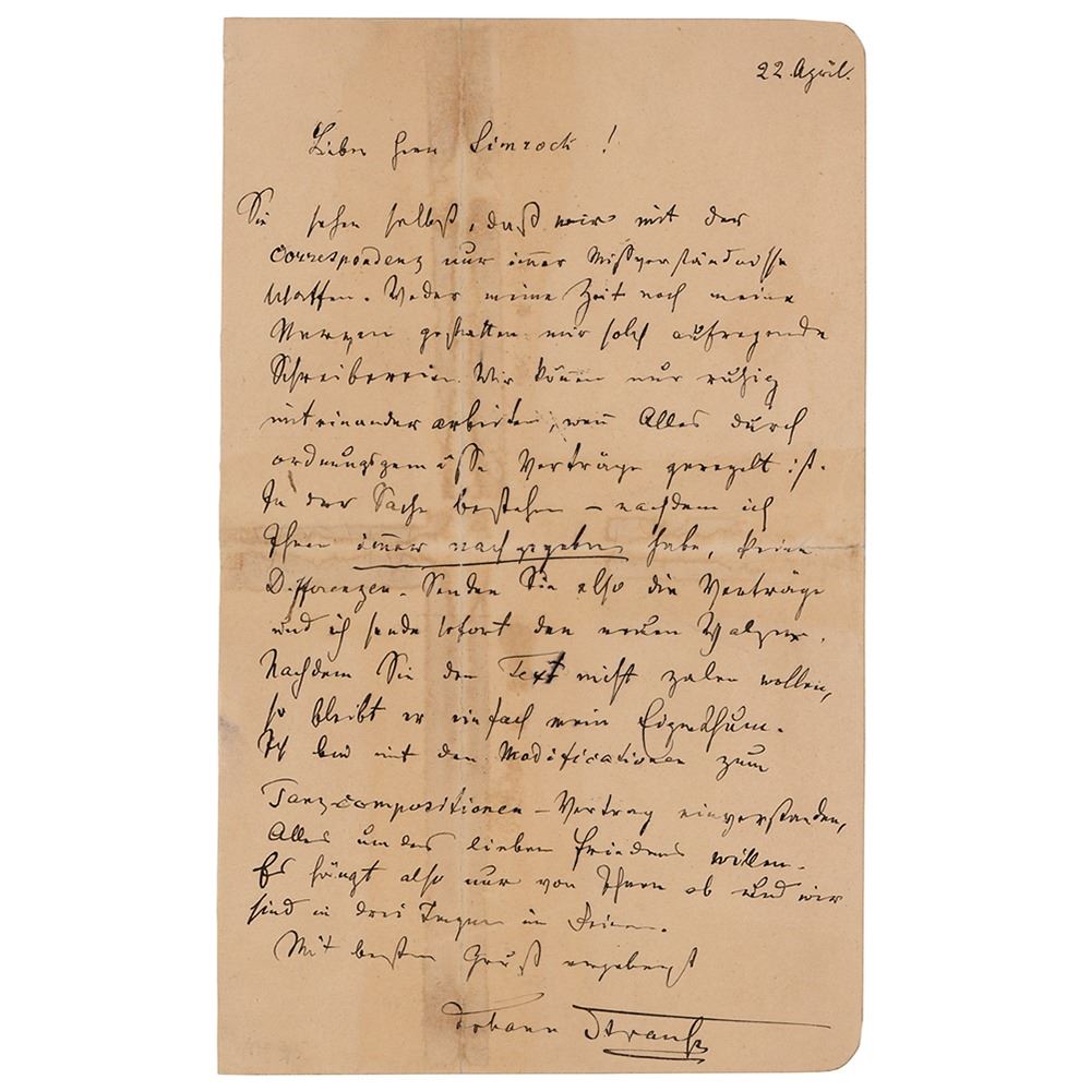 Eminent Viennese composer (1825–1899) known as the 'Waltz King,' who is remembered for such classics as 'The Beautiful Blue Danube' and the 'Emperor Waltz,' and for the operetta staple, 'Die Fledermaus.' ALS in German, one page, 5 x 8, April 22, [no year]. Handwritten letter to his publisher Simrock, who was also the publisher of Brahms and Dvorak. In full (translated): "You see for yourself that our correspondence just creates misunderstandings for me. Neither my time nor my nerves allow me to indulge in all that distressing writing. We can only work together peacefully if everything is regulated by contracts that are in order. There are no differences between us in this matter—because I always gave in to you. Well then, send the contracts and I'll send the new waltz. Since you don't want to pay for the (vocal) text, it will simply remain my property. I'm in agreement with the changes made in the contract for the dance compositions. Anything just for the sake of finally having peace. Therefore it depends only on you—and in three days everything will be straightened out." In very good condition, with complete silking on the back, old tape stains, and well done professional repairs to complete horizontal and vertical separations.