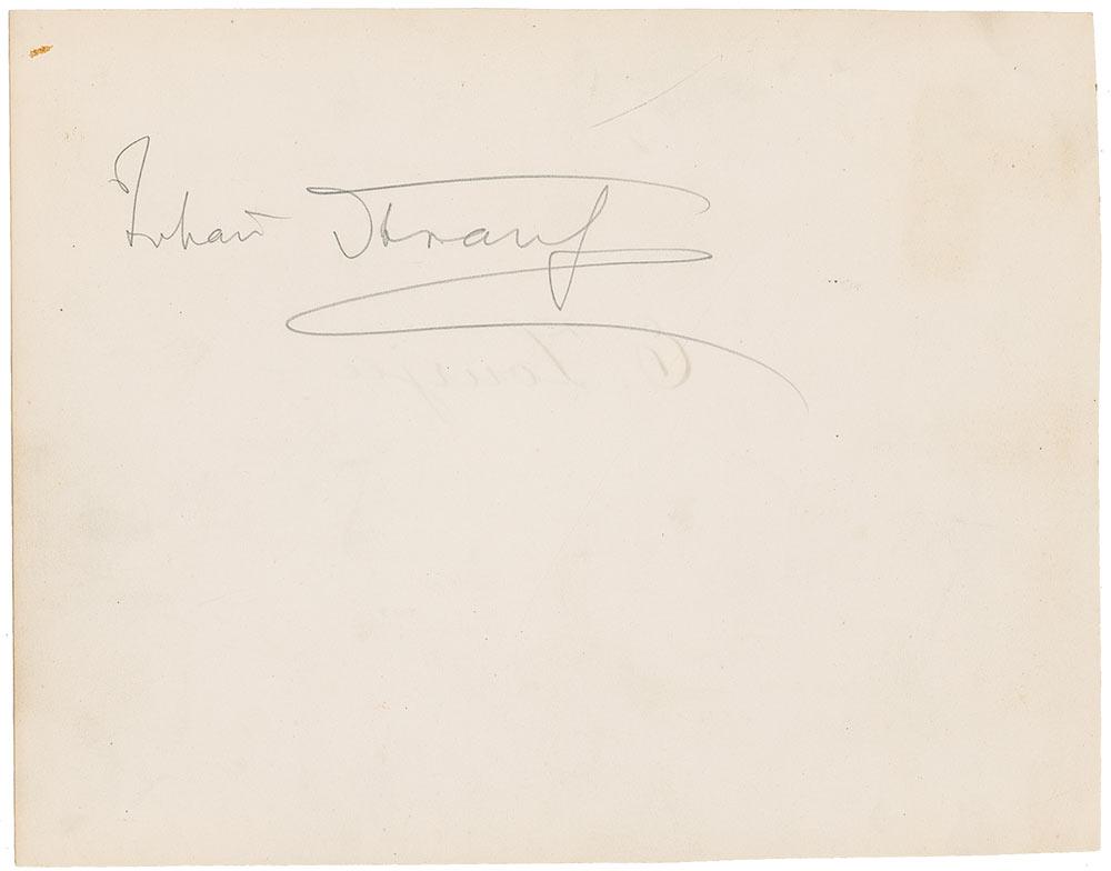 Eminent Viennese composer (1825–1899), known as the ‘Waltz King,’ best known for such all-time favorites as ‘The Beautiful Blue Danube’ and the ‘Emperor Waltz’ and for the operetta staple Die Fledermaus. Large pencil signature on an off-white 8.25 x 6.5 album page. Trimmed right edge, slight edge toning, and show-through from a signature of Eben Tourjee, founder of the New England Conservatory of Music, on the reverse, otherwise fine condition. Accompanied by a 1925 letter of authenticity by American composer Arthur S. Josselyn, whose father had obtained signature during Strauss’s 1872 visit to the World’s Peace Jubilee in Boston, and an unsigned blue silk bookmark from the event.