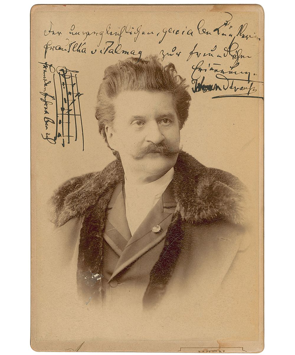 Original 4 x 6 cabinet photo of Strauss II in a large overcoat by V. Angerer of Vienna, inscribed in fountain pen, in German to famous operetta soprano Ilka von Palmay, and signed “Johann Strauss,” adding a two-bar AMQS from the song ‘Tourist I Am,’ from his operetta ‘Princess Ninetta’. In fine condition, with a bit of scattered light toning to borders. Due to the failure of his comic opera ‘Riter Pasman,’ Strauss returned to composing operettas, with ‘Princess Ninetta’ enabling him to prove that he had not lost the ability to compose exceptional waltzes and marches.