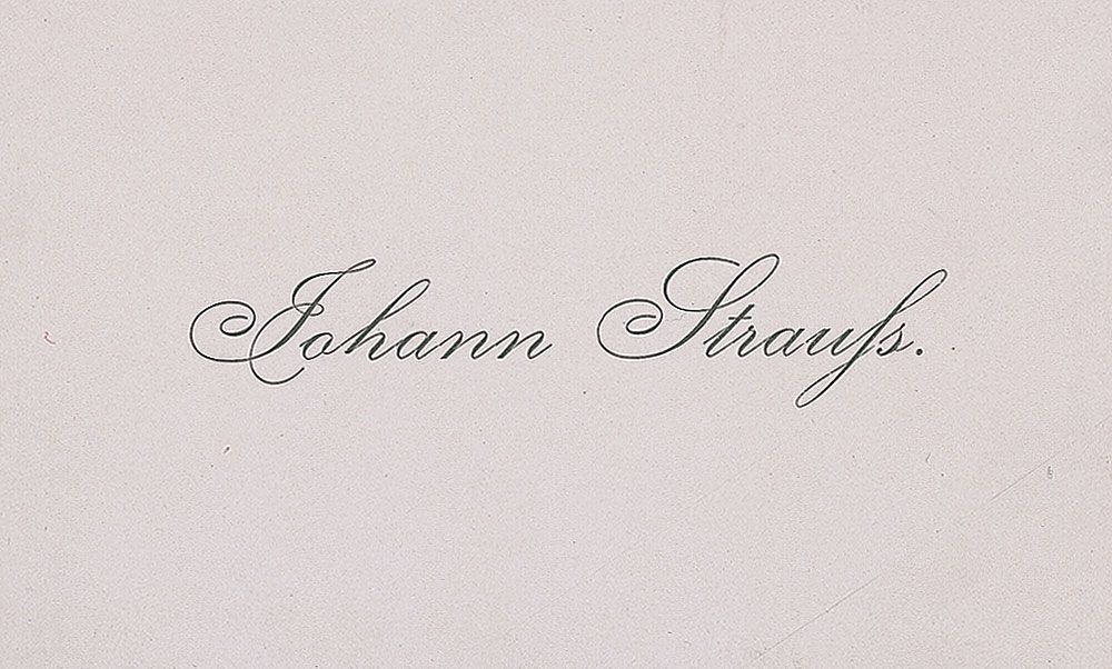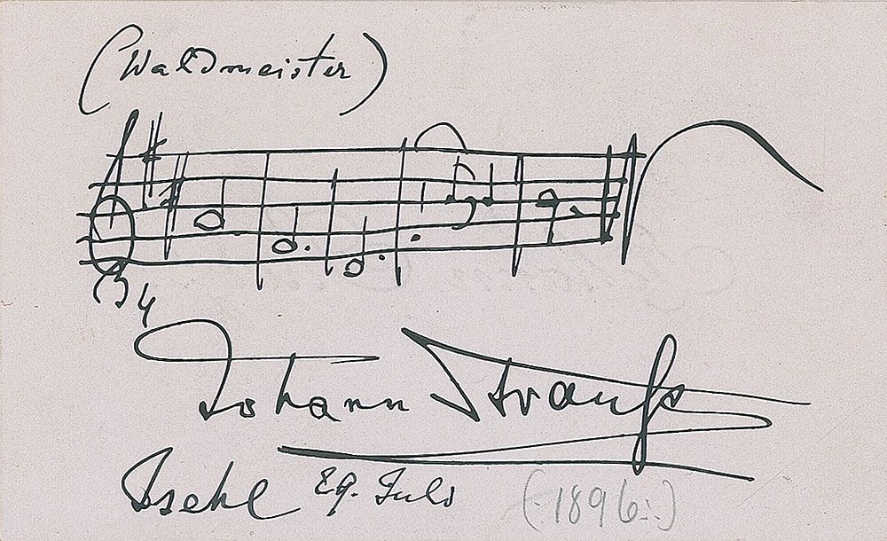Excellent AMQS on the reverse of one of his personal 4 x 2.5 calling cards. Strauss pens three bars from ‘Waldmeister,’ adding the title at the top and signing underneath, with a collector’s date notation of 1896 written in pencil at the bottom. In very fine condition.