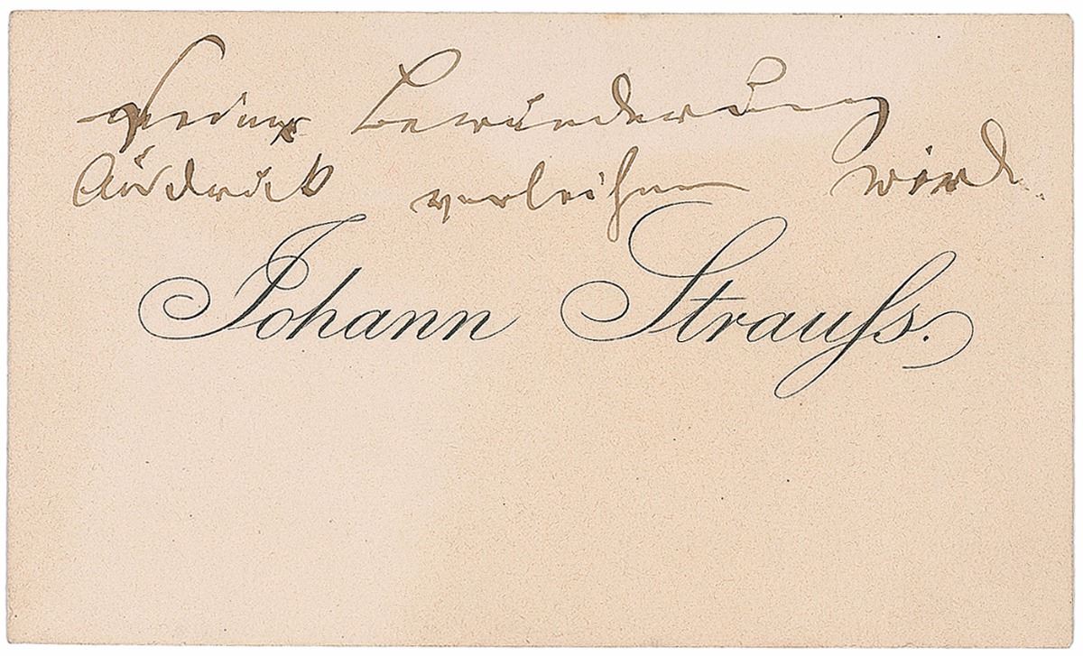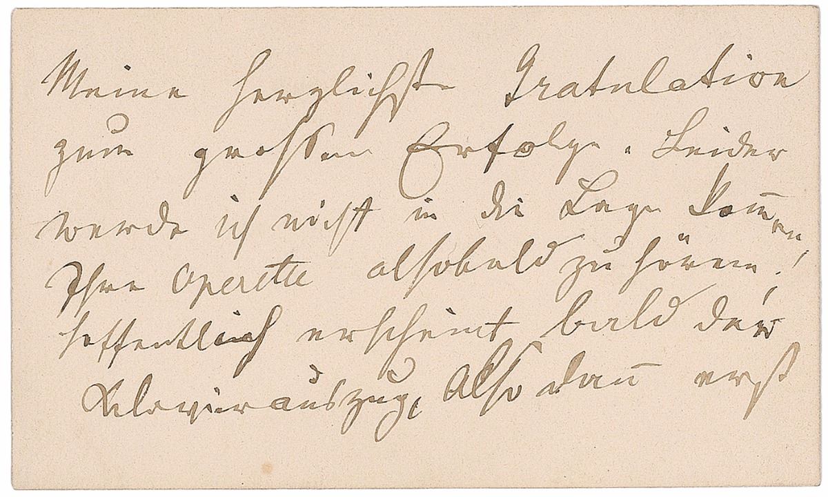 Unsigned handwritten note in German penned on both sides of Strauss’s personal calling card, 3.75 x 2.25, no date. In part (translated): “Hearty congratulations to this great success. Unfortunately I will not be able to hear the operetta soon; I hope that the piano score will be published soon.” In fine condition.