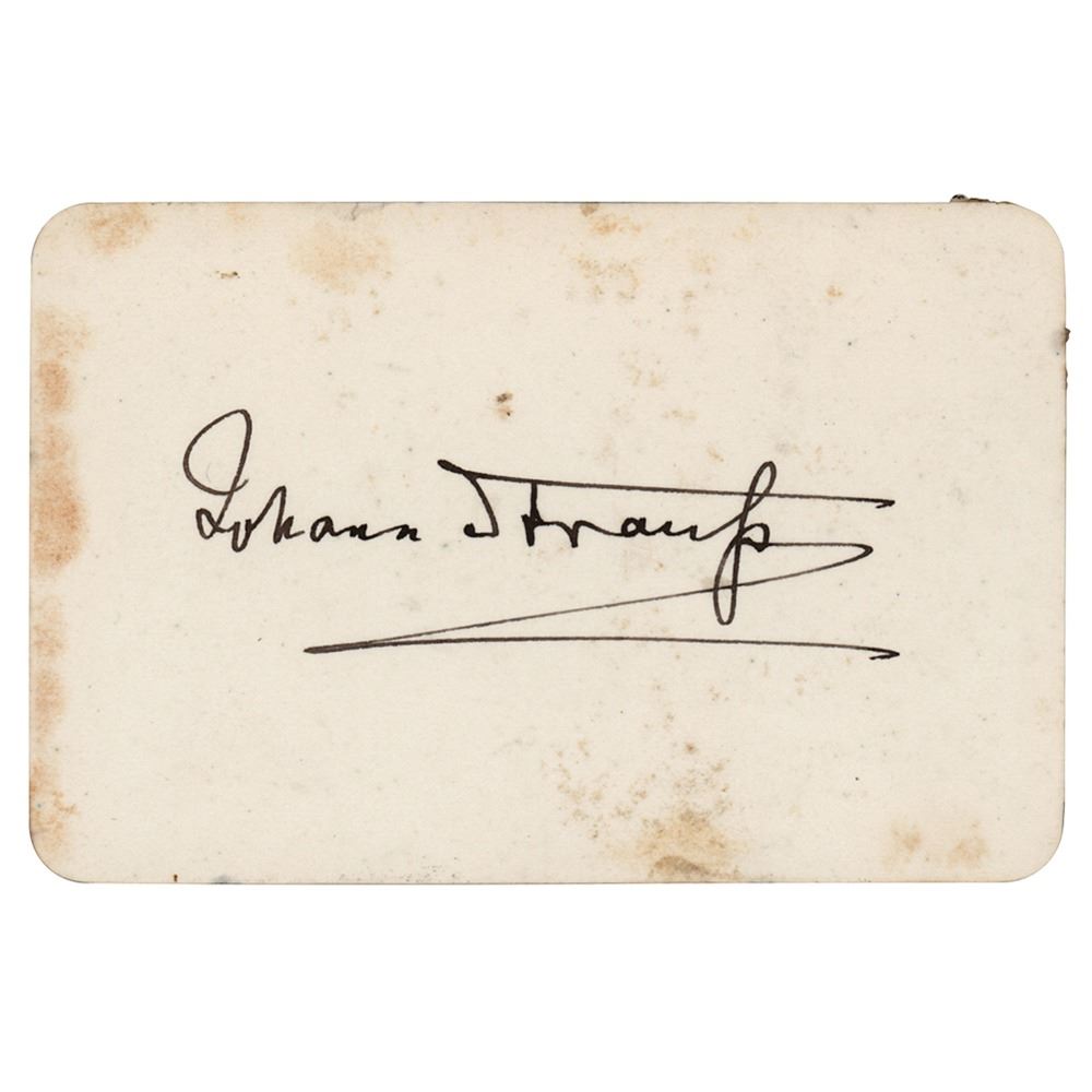 Eminent Viennese composer (1825–1899), known as the 'Waltz King,' best known for such all-time favorites as 'The Beautiful Blue Danube' and the 'Emperor Waltz,' and for the operetta staple Die Fledermaus. Bold ink signature, "Johann Strauss,†on an off-white 3.5 x 2.5 card. In very good to fine condition, with scattered staining, and old mounting remnants on the back.