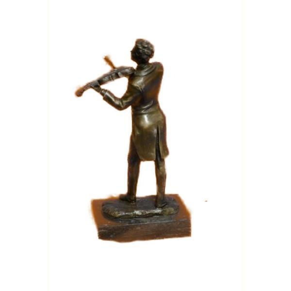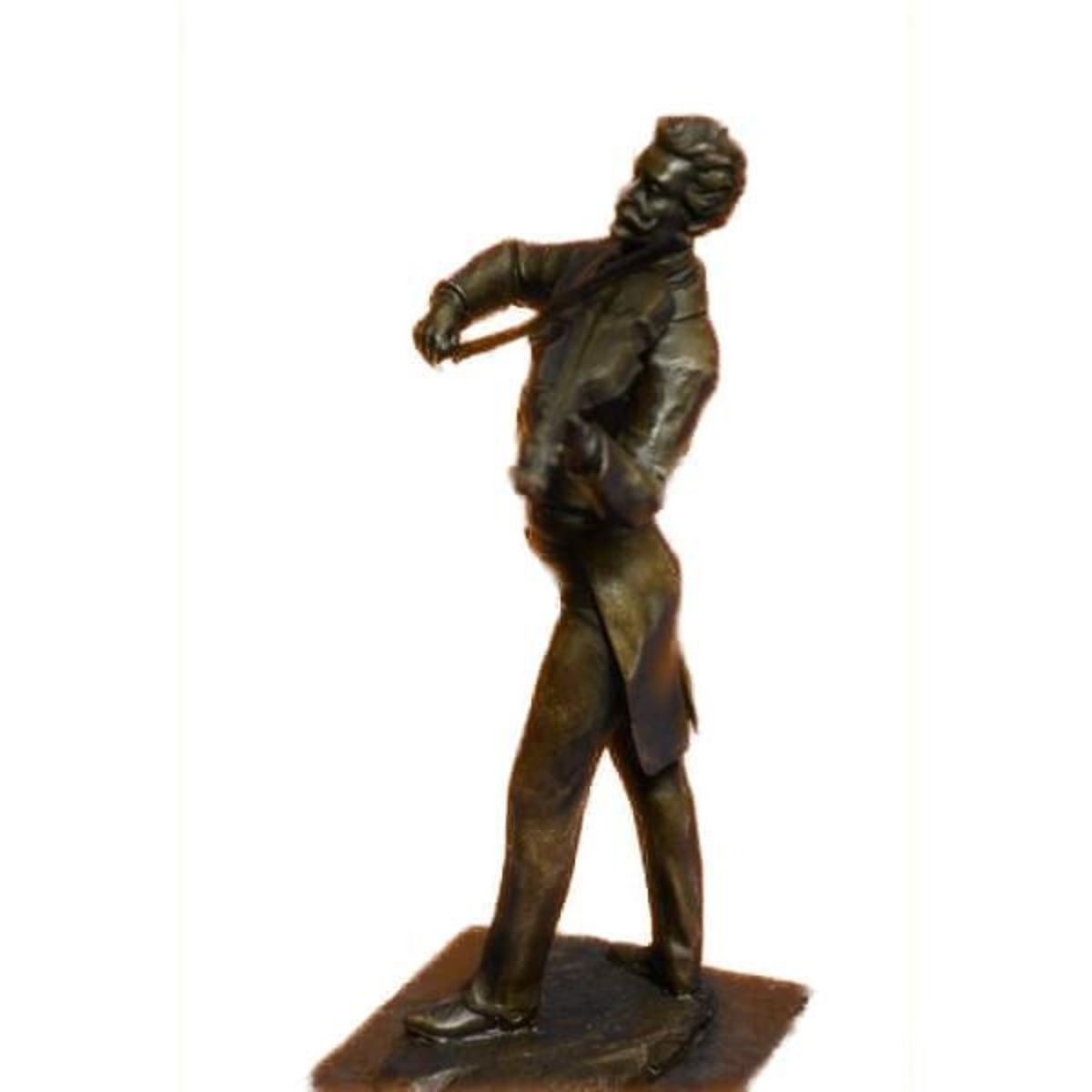 This 100% bronze sculpture honors the memory of Austrian composer Johann Strauss I (1804-1849). He was one of Europe's leading conductors and composers of over 300 works of dance music and establishing his reputation as a composer of Viennese waltzes. Not only fathering music he bore a son, J. Strauss jr.(October 25, 1825 – June 3, 1899), who carried his name and musical talent. He is brilliantly cast in his elegant likeness. His face is cast down as he enigmatically smiles upon his musings. He sports an evening coat and a finely detailed bow tie. His bronze plinth bears his eternal name. J. Strauss was cast using the archaic methods of lost-wax casting and finished with a brown patina stain. He keeps upon a black marble base with the artist Milo's signature. Condition: this sculpture is in perfect condition. Bronze dimensions with marble base:height 9" x width 4" Marble dimensions: 4" x 3". Height without base: 8" Weight : 4 lbs