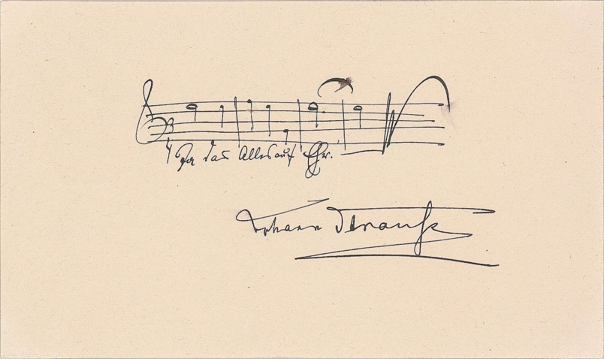 Eminent Viennese composer (1825-1899), known as the 'Waltz King,' best known for such all-time favorites as 'The Beautiful Blue Danube' and the 'Emperor Waltz,' and for the operetta staple Die Fledermaus. AMQS on an off-white 6 x 3.5 album page, beautifully signed below, "Johann Strauss." Strauss pens four bars of music from 'The Gypsy Baron,' with lyrics, "Ja das alles auf 'Ehr.'" In fine condition.