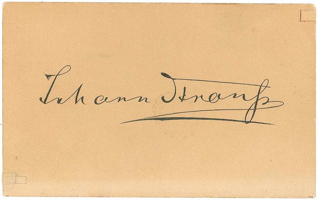 Eminent Viennese composer (1825–1899), aka the “Waltz King,” best known for such all-time favorites as “The Beautiful Blue Danube” and the “Emperor Waltz” and for the operetta staple, “Die Fledermaus.” Ink signature, “Johann Strauss,” on an off-white 4 x 2.5 card. Collector’s notation on reverse indicates signature was received on April 18, 1896. Uniform overall toning, otherwise fine condition.