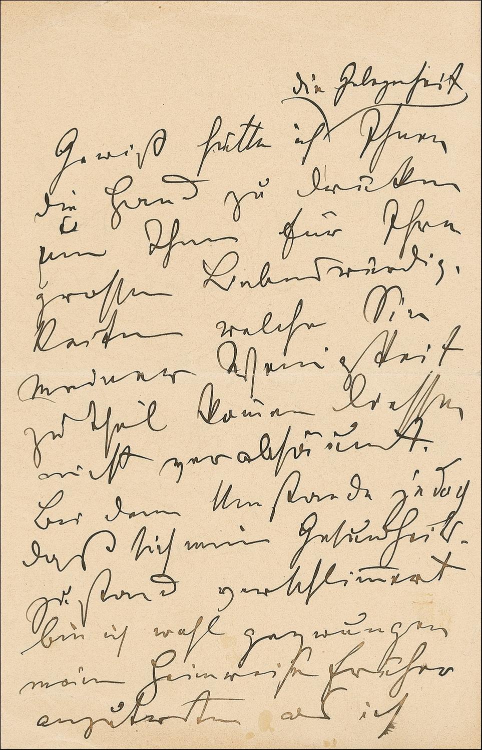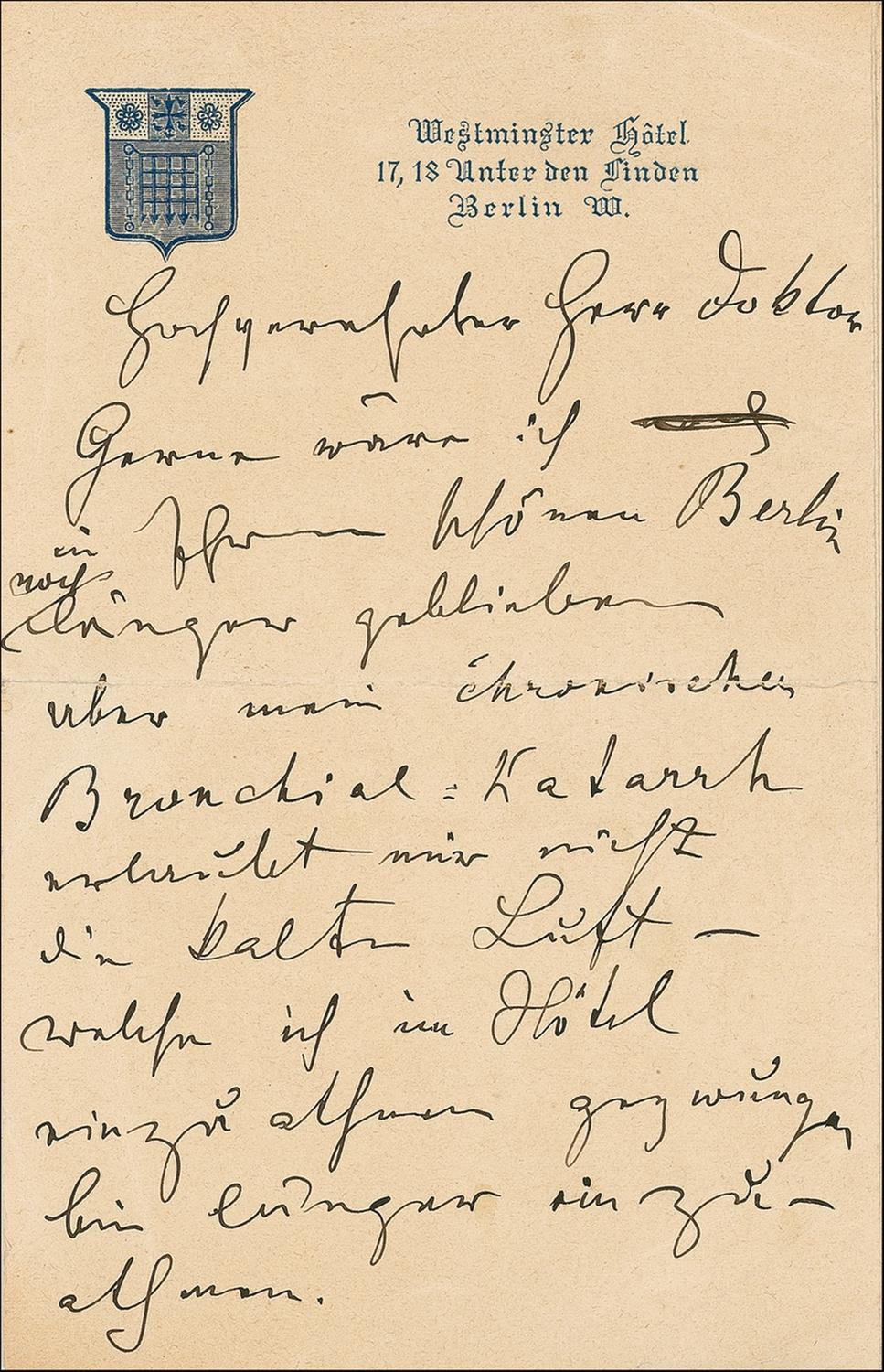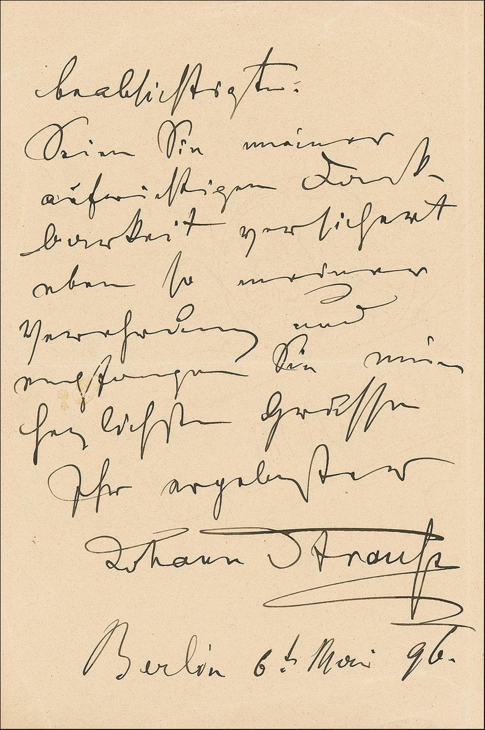 Eminent Viennese composer (1825–1899), known as ‘The Waltz King,’ best known for such all-time favorites as ‘The Beautiful Blue Danube’ and the ‘Emperor Waltz,’ and for the operetta staple, ‘Die Fledermaus.’ ALS in German, three pages on two adjoining sheets, 4.5 x 7, Westminster Hotel, Berlin letterhead, May 6, 1896. Strauss bears farewell to a friend. In part [loosely translated]: “I would have gladly stayed in your beautiful Berlin longer but my chronic bronchial catarrh does not allow me the cold air - which I am forced to breathe longer in the hotel. Certainly I have had the opportunity to shake hands with you for great kindnesses…However, since my health worsened, I'm forced to take up my journey home earlier than I intended.” Scattered light creasing, as well as some mild toning, and a tape repair to horizontal fold on reverse of first page, otherwise fine condition. A desirable example from the popular composer.
