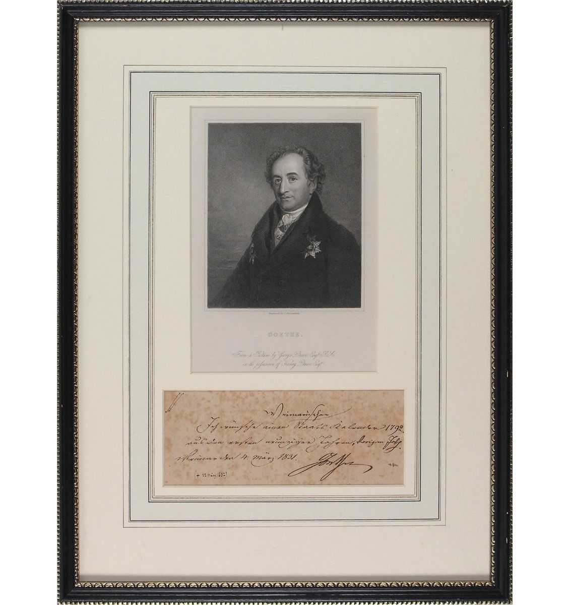 German writer, scientist, and philosopher (1749–1832) who takes a place among the central intellectual and artistic figures of his day. His poetry and dramatic works provided source material for Beethoven, Schubert, and Berlioz, among others. Rare and highly desirable LS in German, signed “Goethe,” one page, 6.5 x 2.5, March 4, 1831. Untranslated note ordering an official Weimar state calendar from 1792. Matted and framed by Goodspeed’s Book Shop in Boston, with a portrait of Goethe, to an overall size of 12 x 16. Moderate scattered overall foxing, not at all affecting the legibility of the bold text and signature, otherwise fine condition. An uncommon and highly sought after signature.