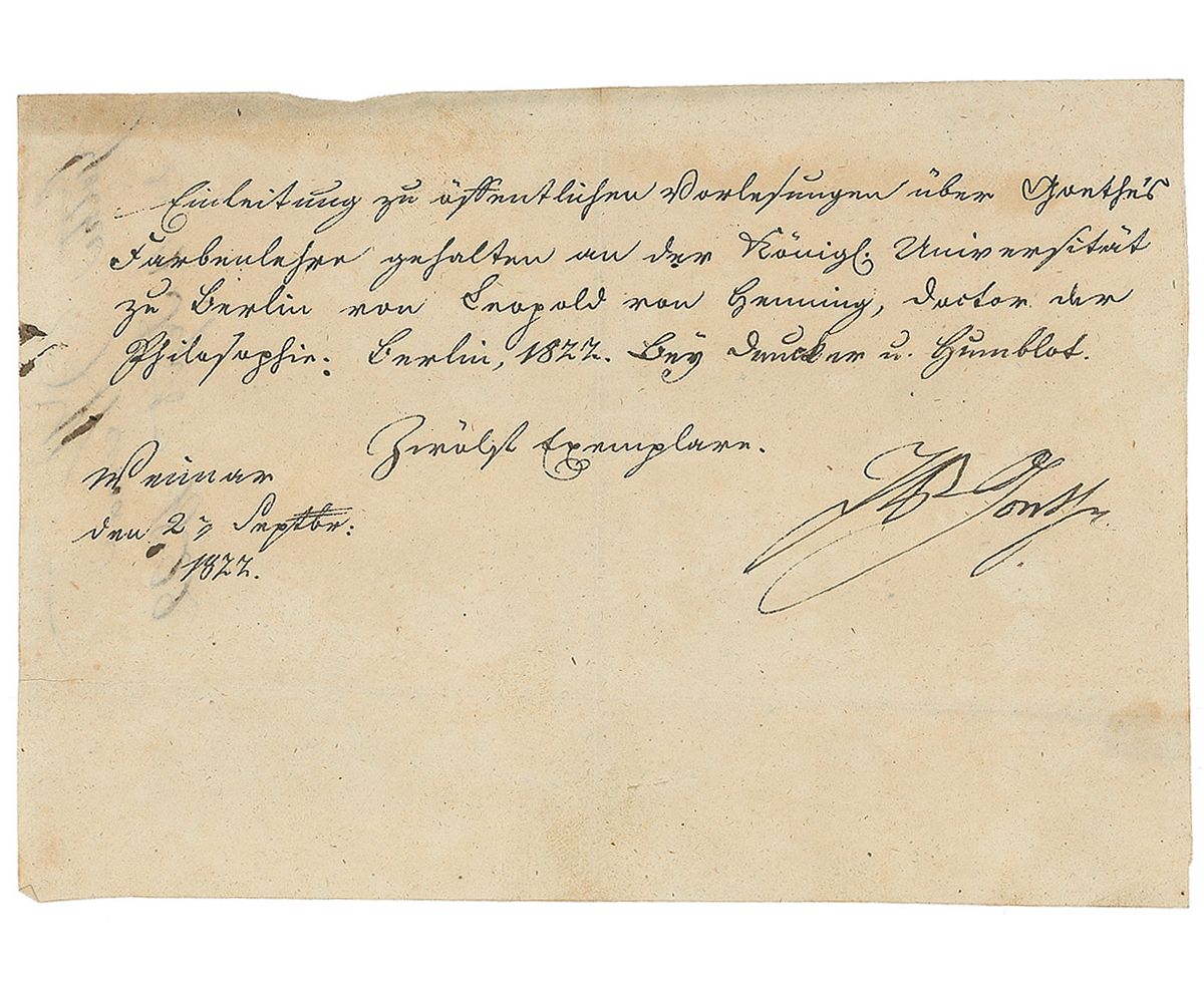 German writer, scientist, and philosopher (1749–1832) who takes a place among the central intellectual and artistic figures of his day. His poetry and dramatic works provided source material for Beethoven, Schubert, and Berlioz, among others. Rare LS in German, signed “J. W. v. Goethe,” one page, 6.5 x 4.5, September 2, 1822. An order directed to the Hoffman book store. Goethe requests twelve copies of “Introduction to the public lectures about Goethe’s theory of colours held at the Royal University of Berlin by Leopold von Henning, doctor of philosophy: Berlin, 1822. Duncker and Humblot.” In fine condition, with vertical and horizontal folds (not affecting the signature) and some subtle irregular toning. Accompanied by the original transmittal envelope. Goethe published his Theory of Colours in 1810, containing his thoughts on the way humans perceive color—a groundbreaking work that has affected a wide range of arts and sciences. Leopold von Henning was a philosopher and professor who evidently lectured on Goethe’s theory, which has indeed been influential in the realm of philosophy—the likes of Schopenhauer and Wittgenstein have also discussed it in their work.