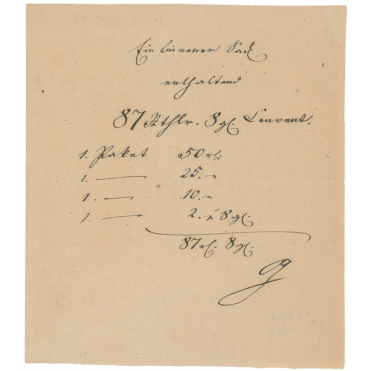 Manuscript DS in German, signed “G,” one page, 5 x 5.75, no date but circa 1822. Goethe acknowledges receipt of a remittance. A note on the reverse in another hand indicates that the text was written by the numismatist and naturalist Friedrich Soret. In fine condition, with expected document wear. Accompanied by an issue of the ‘Weimarische Wochenblatt’ pamphlet dated February 9, 1816. A scarce and highly desirable example.