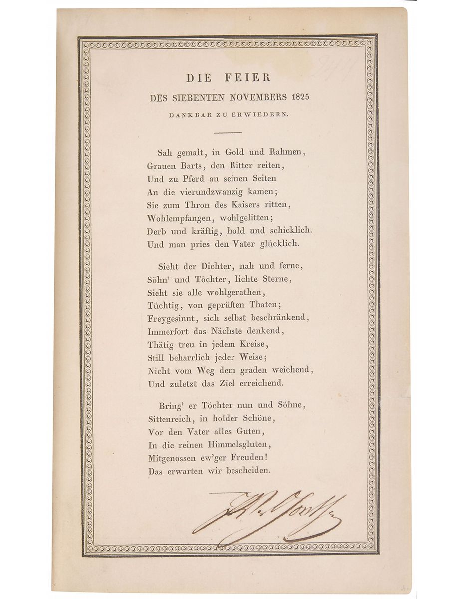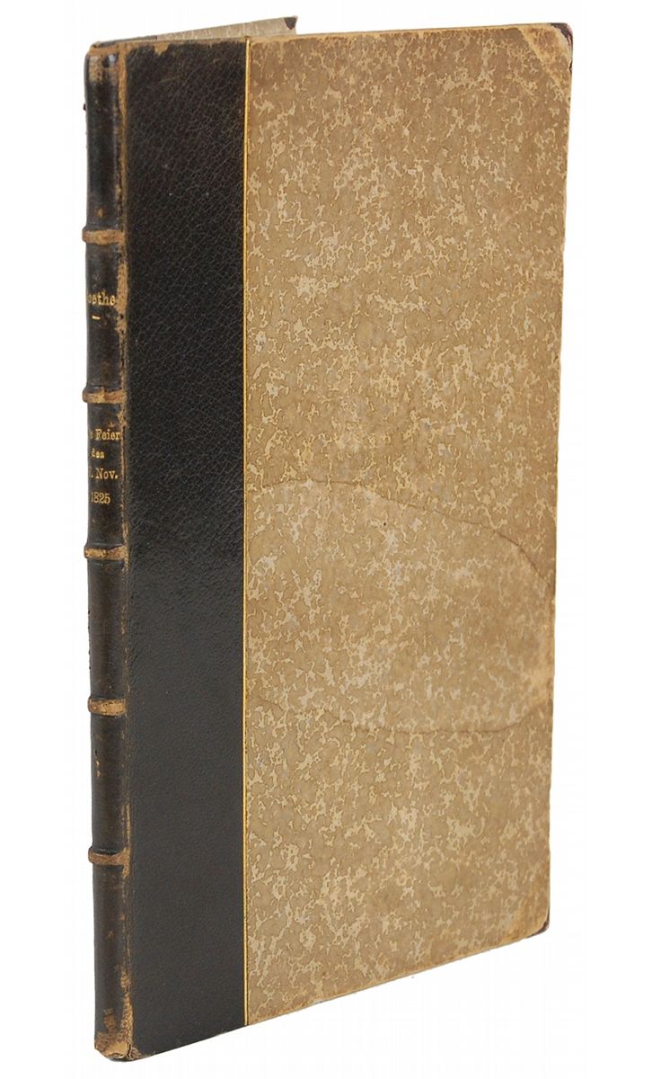 Broadsheet of his poem “Die Feier des siebenten Novembers 1825 dankbar zu erwidern” [The celebration of the seventh of November 1825 grateful to reciprocate], 5 x 8.25, boldly signed at the conclusion in black ink, “J. W. v. Goethe.” The poem is bound within a 5.5 x 8.5 book quarter-bound in leather and marbled paper. Broadsheet is in fine condition with a small tear to the right edge, a diagonal crease from the tear to the lower edge, and a small area of discoloration near upper edge. Book condition: VG-/None. This was apparently published to celebrate the 50th anniversary of Goethe’s arrival in Weimar, where he had been invited to live after the wild success of The Sorrows of Young Werther in 1775. A highly desirable piece from one of the greatest figures in literary history.