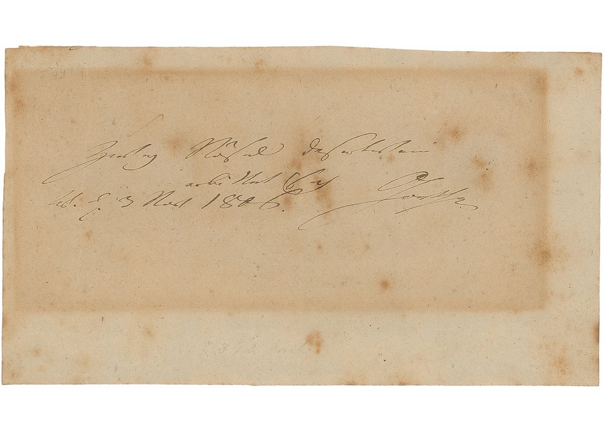 ADS in German, signed “Goethe,” one page, 7.75 x 4.25, November 3, 1806. Goethe orders (translated) “two pints dessert wine.” In very good condition, with a vertical fold, an overall block of toning, and heavy foxing.