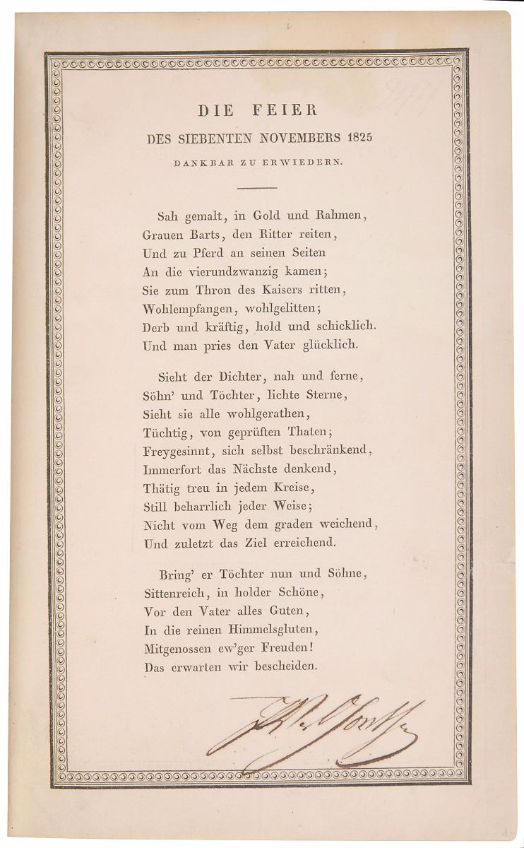 Broadsheet of his poem “Die Feier des siebenten Novembers 1825 dankbar zu erwidern” [The celebration of the seventh of November 1825 grateful to reciprocate], 5 x 8.25, boldly signed at the conclusion in black ink, “J. W. v. Goethe.” The poem is bound within a 5.5 x 8.5 book quarter-bound in leather and marbled paper. Broadsheet is in fine condition, with a small tear to the right edge, a diagonal crease from the tear to the bottom edge, and a small area of discoloration near top edge. Book condition: VG-/None. This was apparently published to celebrate the 50th anniversary of Goethe’s arrival in Weimar, where he had been invited to live after the wild success of The Sorrows of Young Werther in 1775. A highly desirable piece from one of the greatest figures in literary history.