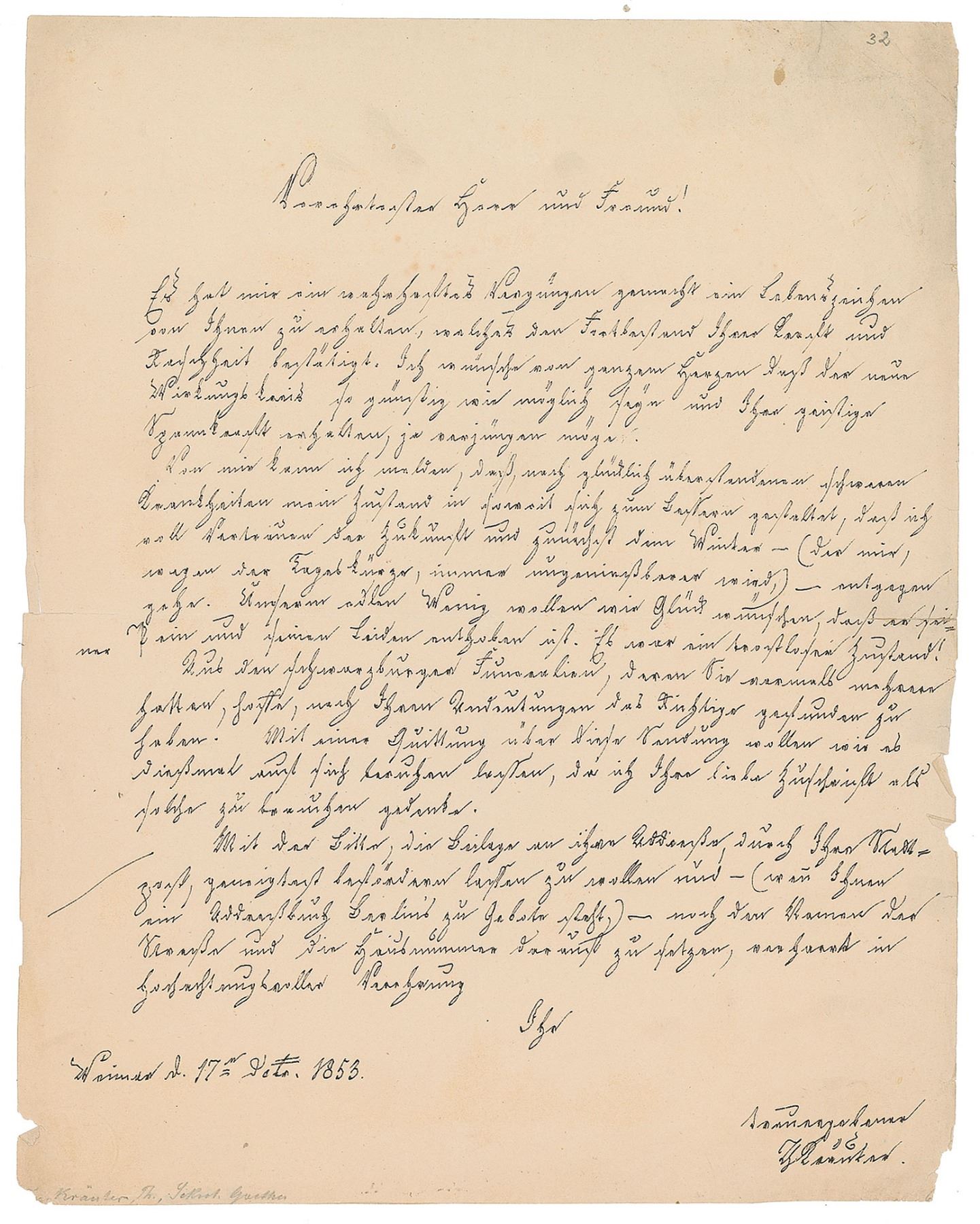 ALS in German, signed “H. Krauter,” one page, 8.25 x 10.5, October 17, 1853. Letter from Goethe’s secretary Theodor Kräuter, in part (translated): “I was truly delighted to receive a sign of life from you, which confirms the continuity of your strength…I wish with all my heart that your new sphere will be as favorable as possible and will maintain your mental elasticity, yes, even rejuvenate it. About myself I can report that, after fortunately overcoming severe illnesses, my condition is now improved as best as can be, so that I am looking forward to the future full of confidence, but first looking towards winter—(which on account of the shortness of the days is becoming more and more disagreeable to me). Let's congratulate our noble Nothingness and wish him well that he has been relieved from his pain and suffering. It was a hopeless situation! From the Schwarzburg, of which you used to have several, I hope to have found the right thing according to your indications. As for a voucher or receipt for this mailing, let's let it be for now, as I intend to use your dear note as such. With the request to kindly be willing to have the insert sent to her address through your municipal post office, and (if you have an address book of Berlin available), please add the name of the street and the house number." In very good to fine condition, with creasing and edge chipping.