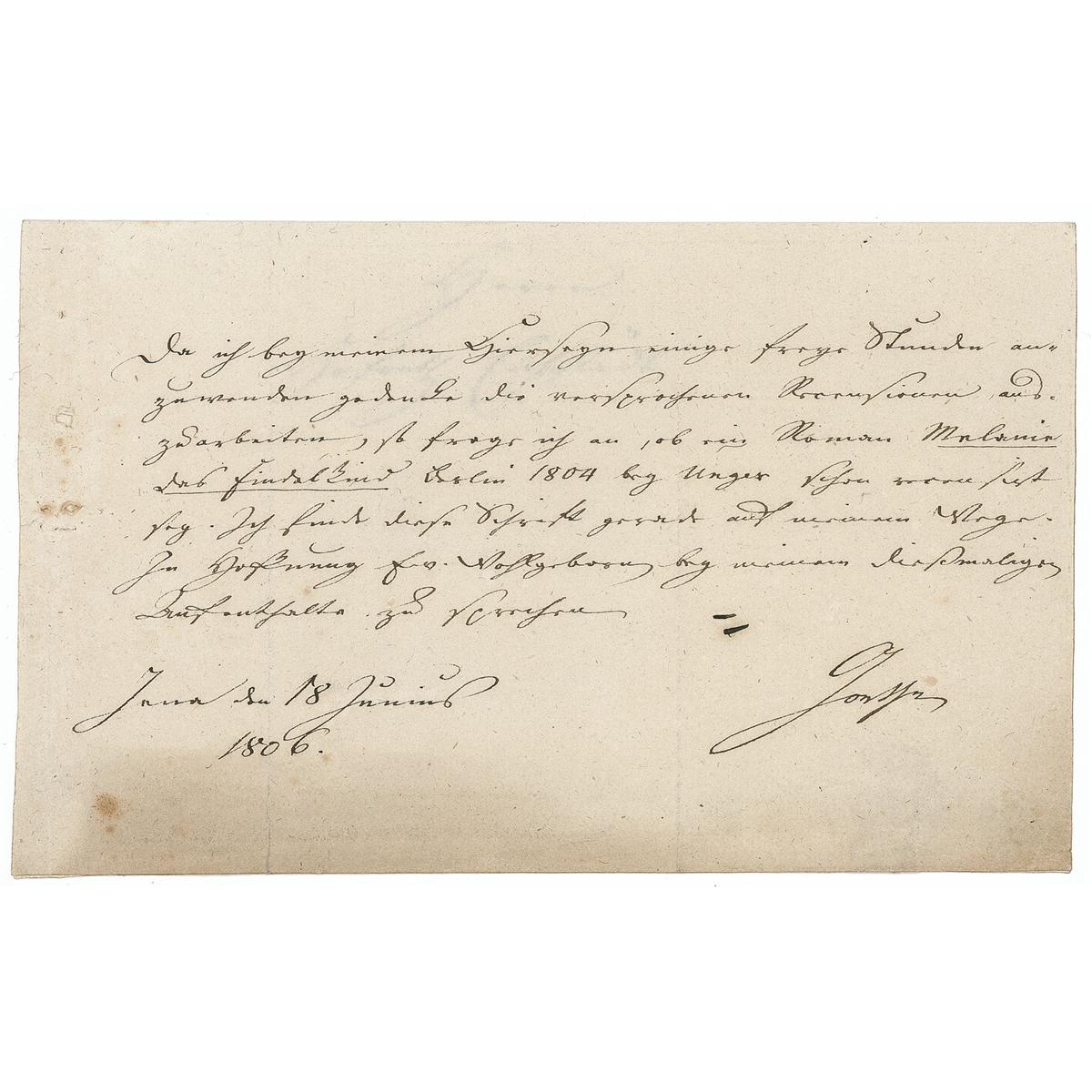 German writer, scientist, and philosopher (1749–1832) who takes a place among the central intellectual and artistic figures of his day. His poetry and dramatic works provided source material for Beethoven, Schubert, and Berlioz, among others. LS in German, signed “Goethe,” one page, 7.25 x 4.5, January 18, 1806. Letter to Eichstädt. In part: ”As I have to spend some hours here to work out the reviews we talked about, therefore I am asking if the novel Melanie das Findelkind, Berlin 1804 published by Unger in 1804 is already revised. I am just finding that papers on the way.” In very good to fine condition, with two vertical folds, marginal binding holes to left edge, a few light creases, and toning to bottom edge.