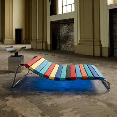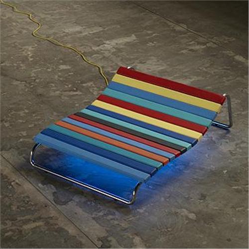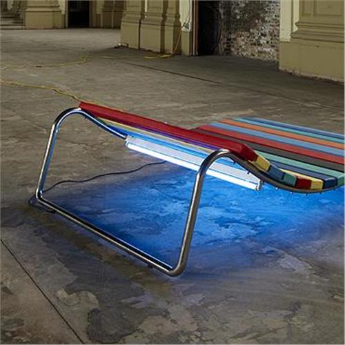vinyl, chrome-plated steel, blue fluorescent tubes