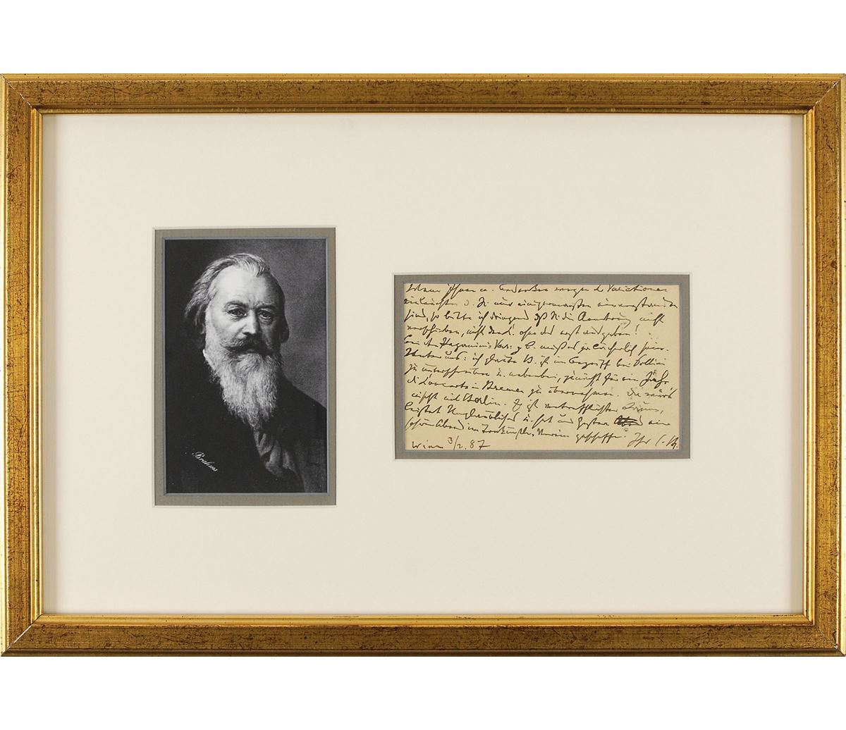 ALS in German, signed “JB,” one page, 5.25 x 3, February 3, 1887. Letter to a correspondent in Berlin, in part: “If my reservations on the variations seem valid to you and if you are even partly in agreement, then I request you urgently not to put off the changes and not to publish the catalogue without them! For instance in the Paganini variations it must really be laughable. Between ourselves, I believe Bulow is about to sign with Pollini and additionally to take over the concerts in Bremen, for one year in the first instance. Then nothing would come of Berlin. He is in excellent spirits, is doing marvelous work, and gave us a fine evening yesterday in the Tonkunstler-Verein.” In fine condition, with some brushing to ink. In addition to establishing the successes of Wagner and Liszt, German conductor Hans von Bulow did the same for Brahms, working diligently to elevate the reputation of a composer he so graciously inserted into the ‘Three Bs’ lineup with Bach and Beethoven.