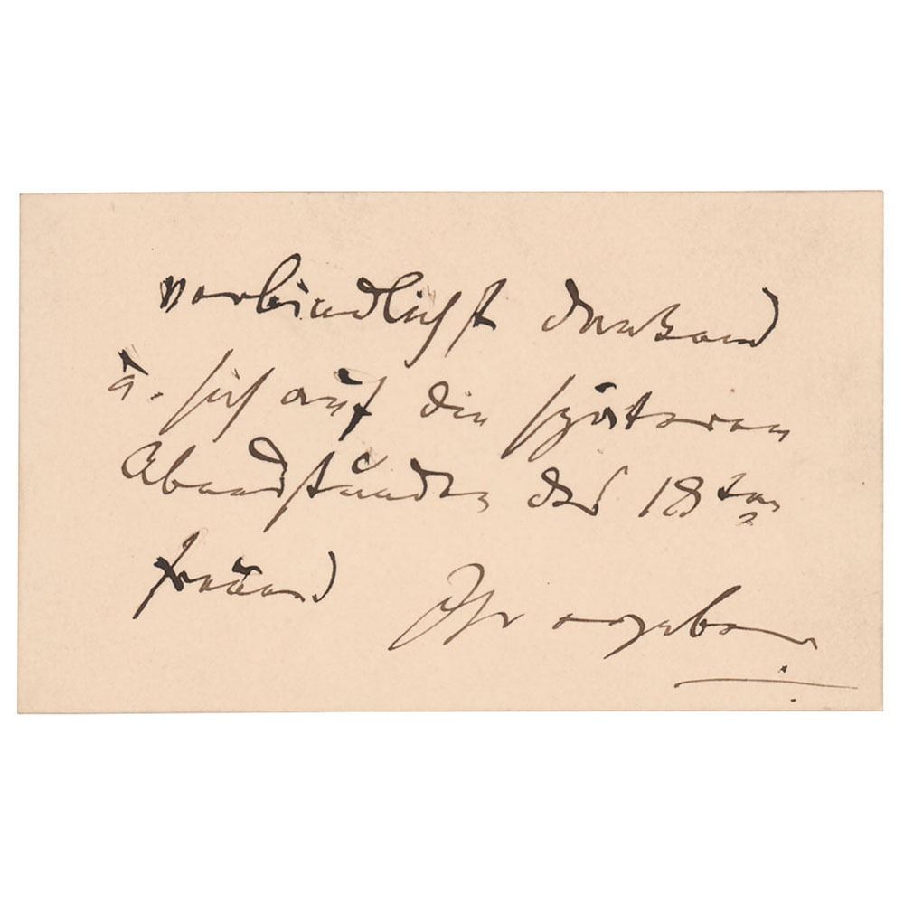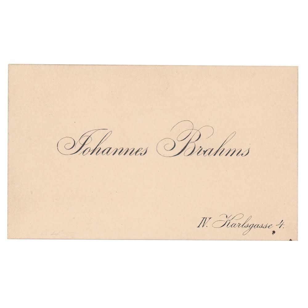 Untranslated handwritten note by Brahms on the reverse of one of his personal calling cards, 3.75 x 2.25, imprinted on the front: "Johannes Brahms, IV. Karlsgasse 4." In very fine condition.