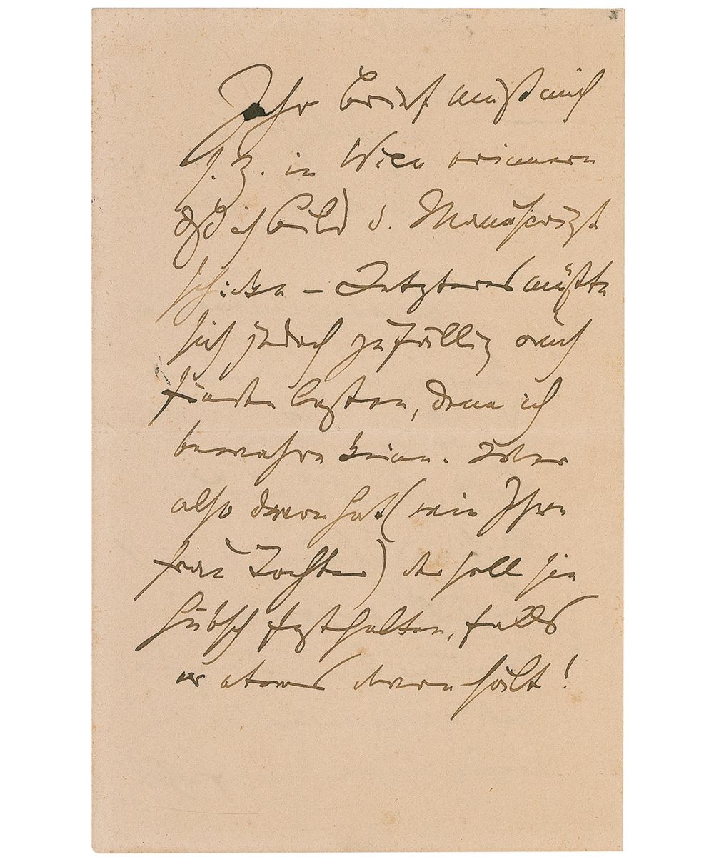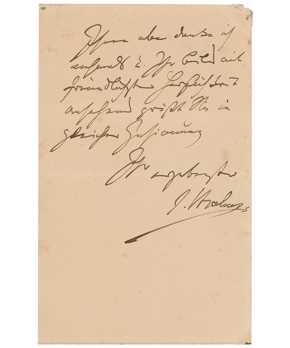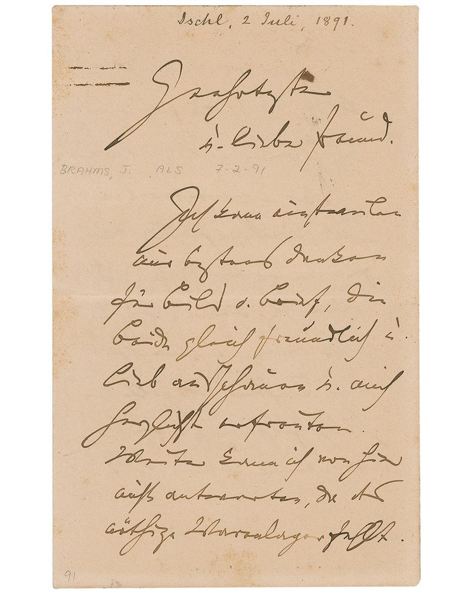 Famed German composer (1833–1897) whose works in the Classical spirit, written in the midst of the Romantic era, take a place among the most enduring music of the 19th century. Among his best-known works are four symphonies, numerous concerti, all manner of chamber and keyboard works, and the large-scale choral masterpiece German Requiem. ALS in German, signed “J. Brahms,” three pages on two adjoining sheets, 4.5 x 7, July 2, 1891. The composer writes from Bad Ischl to his “esteemed, dear friend,” translated, in full: “At this time, I am only able to express my sincere thanks for the picture and letter you sent. Both equally pleasant, the picture is indeed a pretty sight. I was absolutely delighted to receive them. While I am giving my answer from here, I must admit the necessary inspiring spark evades me right now. Once I am back in Vienna, your letter will be a reminder for me to send the manuscript as soon as I get it ready, although the latter will need a thorough work over, as I want to elaborate more on the initial idea. I will be keenly interested to hear what others (particularly your daughter) think about it and not hold back!” Scattered light areas of toning and foxing, a light paperclip impressions, stray ink marks towards the top left corner, and a few pencil notations, otherwise fine condition. From 1889 through the end of his life, Brahms would spend his summers in Bad Ischl, a town in the southern part of Upper Austria. Although Brahms had planned on resigning his life as a composer in his elder years, he continued on, unable to hold his natural gifts and inclinations at bay. A desirable letter from the composers later years, illustrating his inherent drive to create.