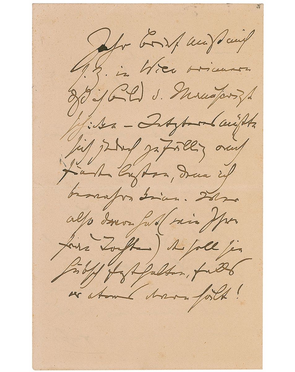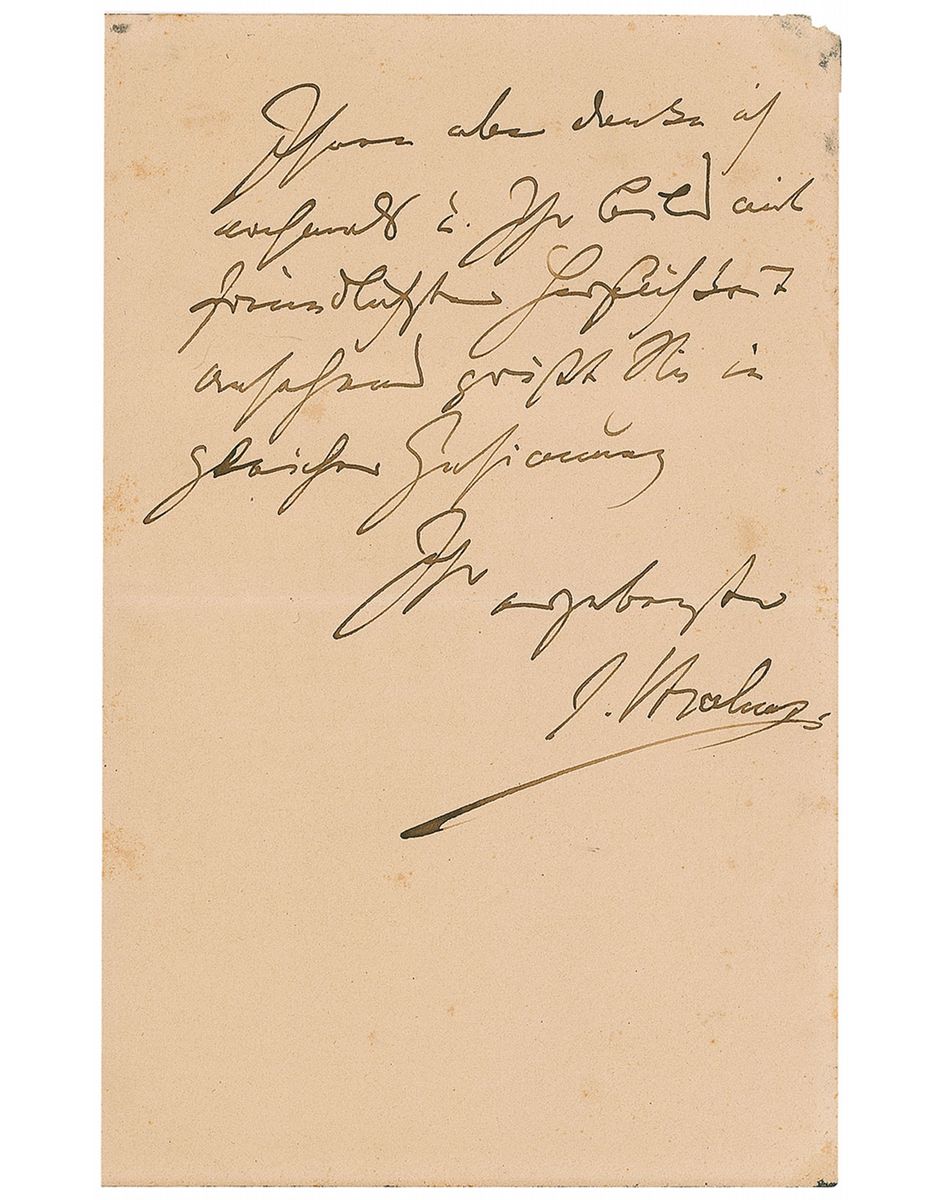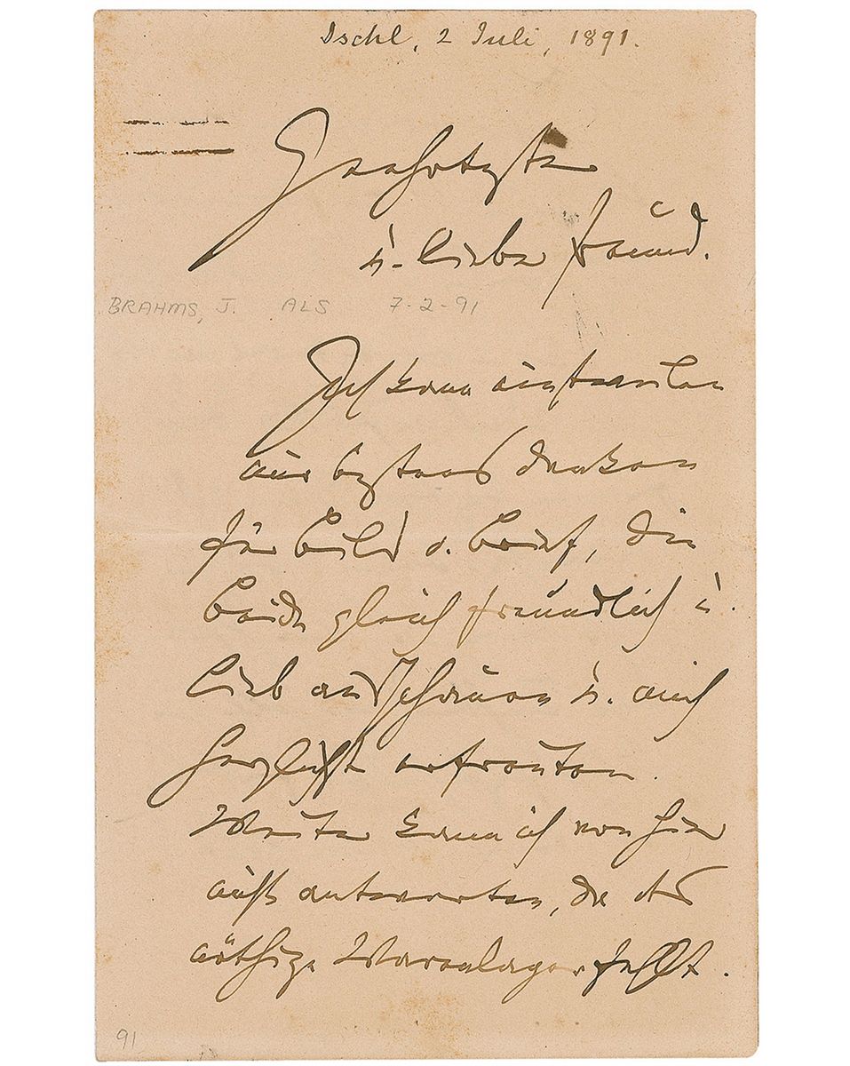Famed German composer (1833–1897) whose works in the Classical spirit, written in the midst of the Romantic era, take a place among the most enduring music of the 19th century. Among his best-known works are four symphonies, numerous concerti, all manner of chamber and keyboard works, and the large-scale choral masterpiece German Requiem. ALS in German, signed “J. Brahms,” three pages on two adjoining sheets, 4.5 x 7, July 2, 1891. The composer writes from Bad Ischl to his “esteemed, dear friend,” translated, in full: “At this time, I am only able to express my sincere thanks for the picture and letter you sent. Both equally pleasant, the picture is indeed a pretty sight. I was absolutely delighted to receive them. While I am giving my answer from here, I must admit the necessary inspiring spark evades me right now. Once I am back in Vienna, your letter will be a reminder for me to send the manuscript as soon as I get it ready, although the latter will need a thorough work over, as I want to elaborate more on the initial idea. I will be keenly interested to hear what others (particularly your daughter) think about it and not hold back!” Scattered light areas of toning and foxing, a light paperclip impression, stray ink marks towards the top left corner, and a few pencil notations, otherwise fine condition. From 1889 through the end of his life, Brahms would spend his summers in Bad Ischl, a town in the southern part of Upper Austria. Although Brahms had planned on resigning his life as a composer in his elder years, he continued on, unable to hold his natural gifts and inclinations at bay. A desirable letter from the compose’rs later years, illustrating his inherent drive to create.