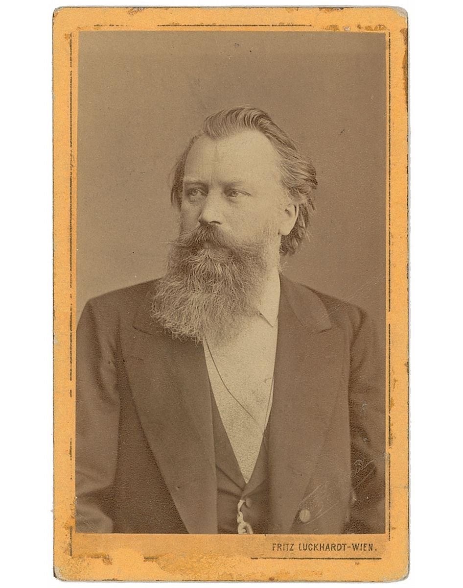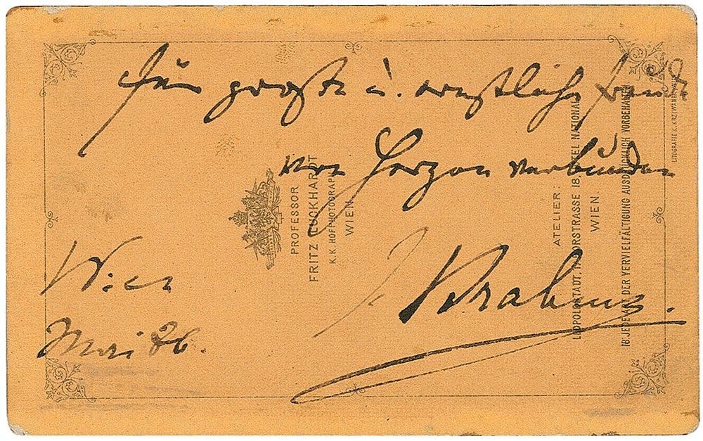 Famed German composer (1833–1897) whose works in the classical spirit, written in the midst of the Romantic era, take a place among the most enduring music of the 19th century. Rare 2.5 x 4 carte-de-visite photo of Brahms by Fritz Luckhardt of Vienna, vertically inscribed in German on the reverse and signed in black ink, “J. Brahms, Wien, Mai 86.” In fine condition, with some light surface loss to edges on both the front and reverse. A crystal-clear image, boldly signed and inscribed shortly before writing his ‘Violin Sonata No. 2.’