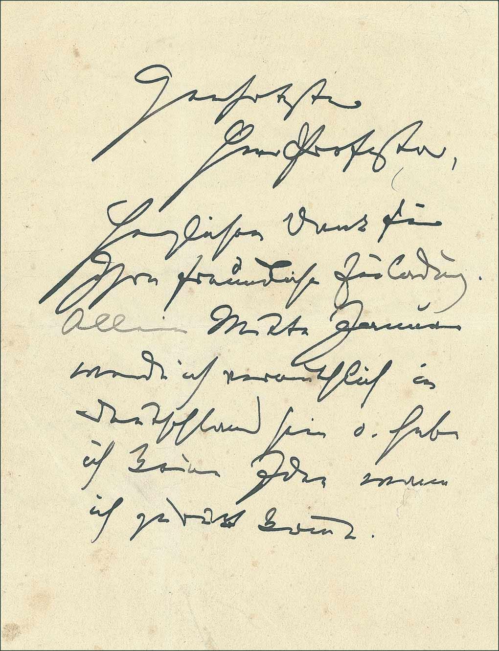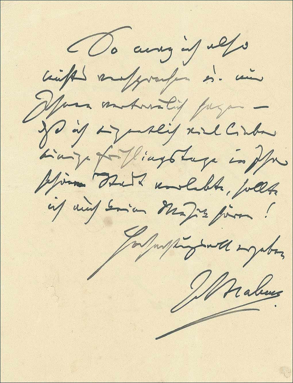 ALS in German, signed “J. Brahms,” one page both sides, 5.25 x 6.75, no date. Brahms writes to an unknown professor, in full: “Cordial thanks for your friendly invitation. The only thing is, mid-January I will probably be in Germany and I have no idea when I’ll be coming back. I therefore can’t promise anything. But I’d like to tell you confidentially that I’d rather spend a few spring days in your lovely city, even if I don’t get to hear any music!” In very good condition, with intersecting folds, scattered creasing, lightly affecting signature, two small holes, neither affecting text, and some scattered light soiling, foxing, and toning. An enjoyable glimpse into Brahms’ lighter side!