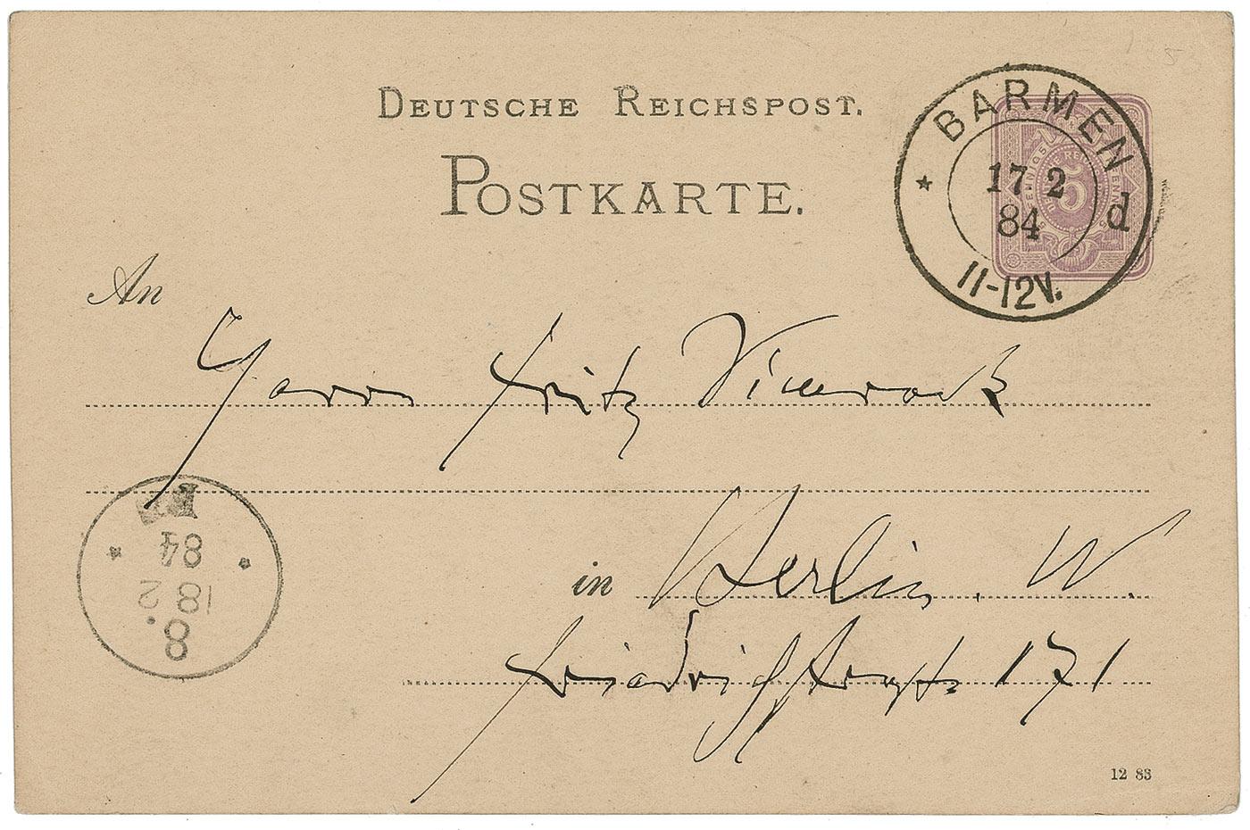 Famed German composer (1833–1897) whose works in the Classical spirit, written in the midst of the Romantic era, take a place among the most enduring music of the 19th century. Among his best-known works are four symphonies, numerous concerti, all manner of chamber and keyboard works, and the large-scale choral masterpiece German Requiem. ALS in German, signed “JB,” on a 5.5 x 3.5 postal card, no date, but postmarked February 17, 1884, and addressed on the reverse in Brahms’ hand. Letter to to his publisher, Fritz Simrock. The immensely talented marvel of the Romantic era writes in full (translated): “In the interest of the heavily taxed audience, I hope that you listen to my very recent lecture! I forgot to say, however, that there is such a second piano part at Herzogenberg that you can, of course, use immediately. I will go to Crefeld tomorrow and hope to be able to write to you as well as several others. 21-23 Elberfeld, then Amsterdam.” In fine condition, with two small pencil notations.