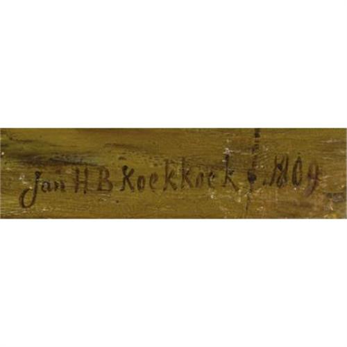 <B>JOHANNES HERMANUS BAREND KOEKKOEK </B></I>(Dutch 1840-1912)<BR><I>Seaweed Gatherers</B></I>, 1809<BR>Oil on panel<BR>16 x 24-1/2 inches (40.6 x 62.2 cm)<BR>Signed and dated lower right<BR> <B>Condition Report:</B> Panel cracked and repaired with butterfly joints<BR><BR><b>Shipping:</b> Requires 3rd Party Shipping (<a target="_blank" href="http://www.heritageauctions.com/common/shipping.php">view shipping information</a>)