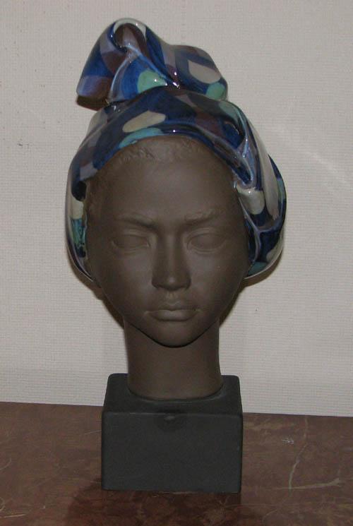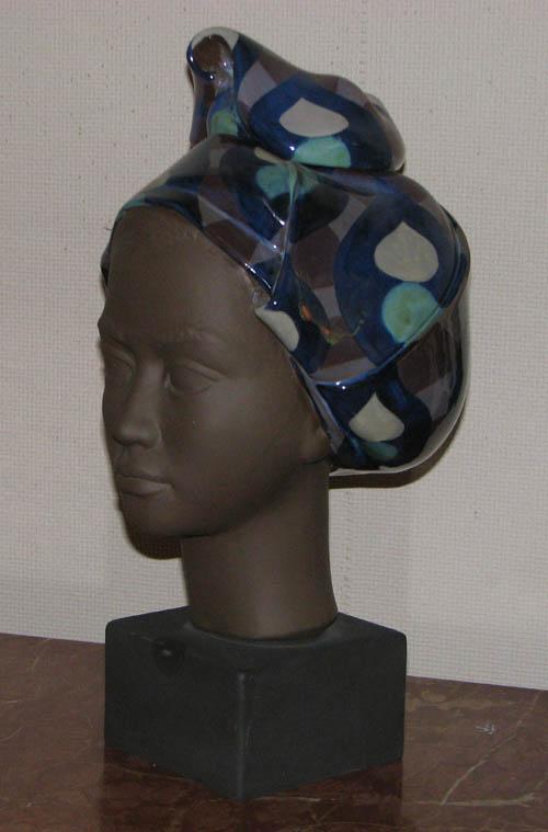 Title: Head of a Woman with Colorful Head Wrap (top of wrap is removable lid)