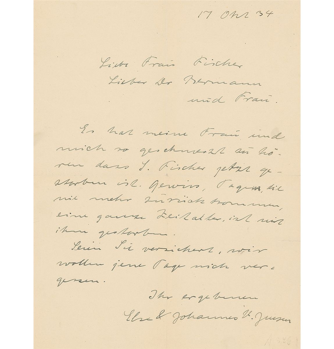 Danish author (1873–1950) who was awarded the Nobel Prize in Literature in 1944. ALS in German, one page, 8.25 x 10.75, October 17, 1934. Untranslated letter signed at the conclusion by Jensen and his wife. In fine condition, with central horizontal and vertical folds, a small repaired tear to right edge, and a small separation at intersection of folds.