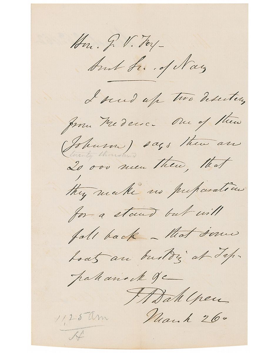 Naval leader (1809–1870) who headed the Union Navy's ordnance department during the Civil War and developed a number of guns and cannons. ALS signed “J. A. Dahlgren,” one page, 5 x 8, March 26, [no year]. Letter to the assistant secretary of the navy. In part: “I send up two deserters…one of them (Johnson) says there are 20,000 men there, that they make no preparation for a stand but will fall back—that some boats are building at Tappahanock [sic] &c.” In fine condition, with intersecting folds (one vertical fold passing through a single letter of the signature), slight brushing to some text, and a few pencil notations. Accompanied by an unsigned original carte-de-visite bust portrait of Dahlgren in uniform.