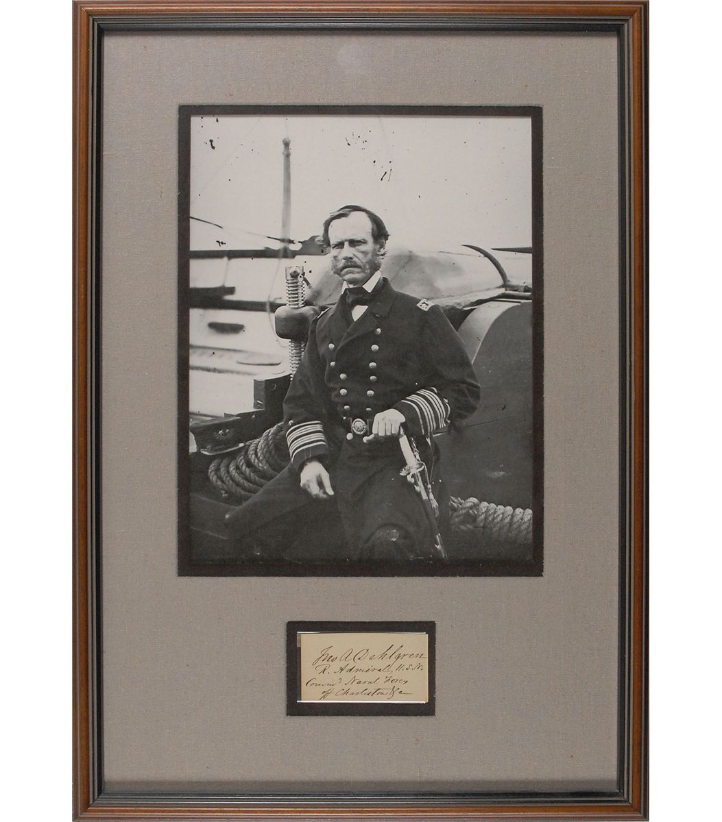 Naval leader (1809–1870) who headed the Union Navy's ordnance department during the Civil War and developed a number of guns and cannons. Bold ink signature, “Jno. A. Dahlgren, R. Admiral U. S. N., Comms Naval Forces off Charleston, VA,” on an off-white slip. Cloth-matted and framed with a portrait of Dahlgren in full uniform posing by a cannon to an overall size of 13.5 x 19.25. In fine condition.