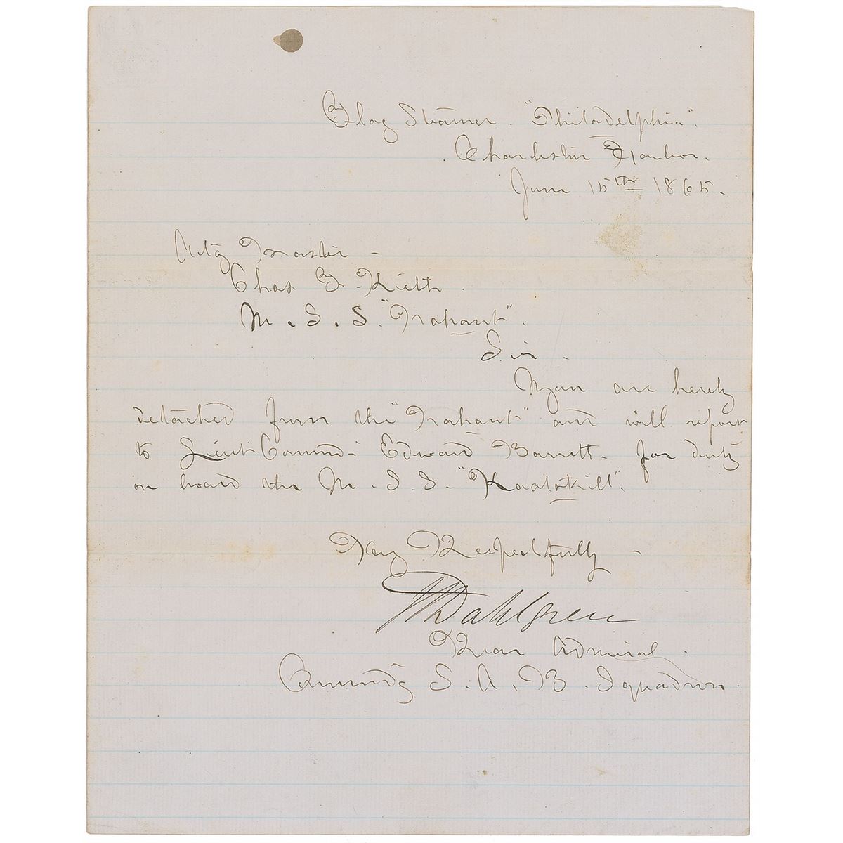 Naval leader (1809–1870) who headed the Union Navy's ordnance department during the Civil War and developed a number of guns and cannons. LS signed “J. A. Dahlgren,” one page, 7.75 x 9.75, June 15, 1865. Letter to Charles Keith on the USS Nahant. In full: “You are hereby detached from the ‘Nahant’ and will report…for duty on board the U. S. S. ‘Kaatskill [sic].’” In fine condition, with scattered soiling and a stray ink blot to the upper left.